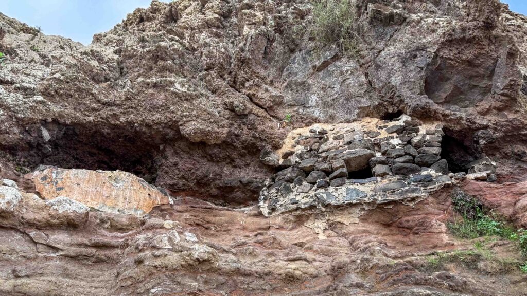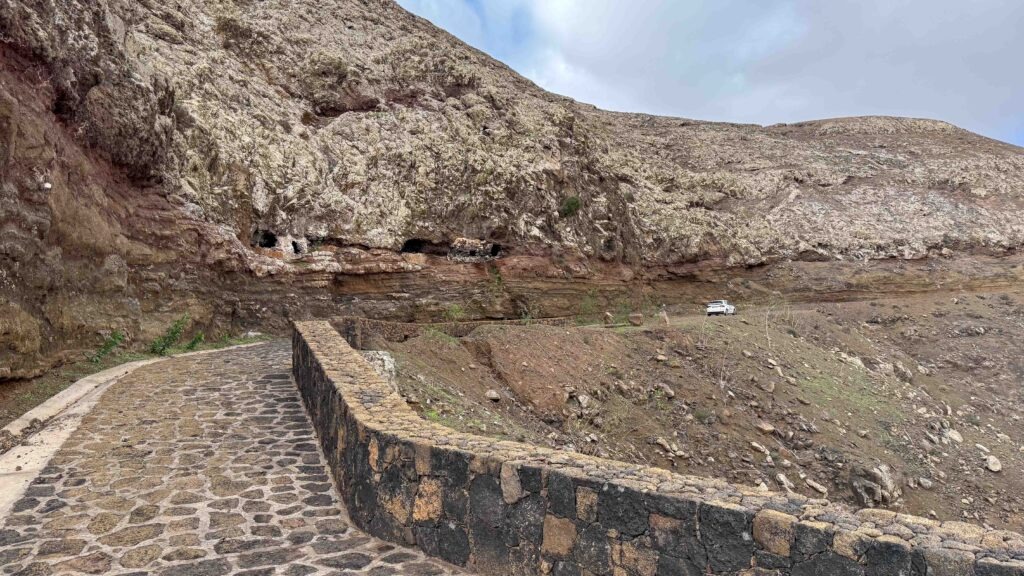 Es ging auf einer Teerstrasse den Berg hoch, die Strasse wurde zum Feldweg und immer enger. Links ging es fast senkrecht hinunter und an umdrehen war nicht mehr zu denken. Wir mußten also hoffen, dass am Ende des Wegs eine Möglichkeit zum Wenden bestehen würde. Wir waren sehr überrascht, als wir am Ende dieses Wegs eine Mini-Quelle voller Mosquito-Larven, aber auch einen Mirador mit fantastischer Aussicht und sogar 2 Höhlenwohnungen vorfanden. Hier wurde viel EU-Geld investiert, um einen Ort zu verwirklichen, den kaum jemand besucht. Wir konnten glücklicherweise gut wenden und schauten uns dann die Umgebung an. Karin telefonierte sogar noch einige Zeit mit Christel in Tübingen.