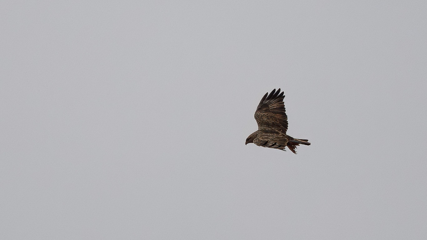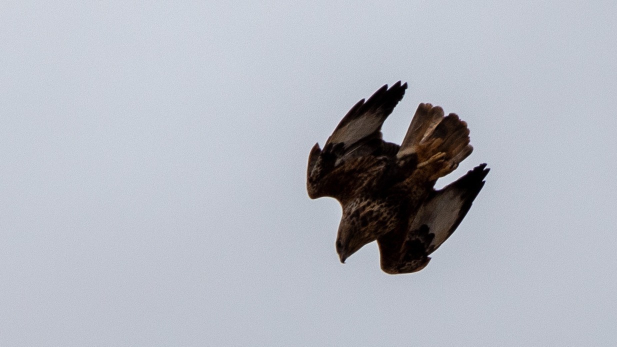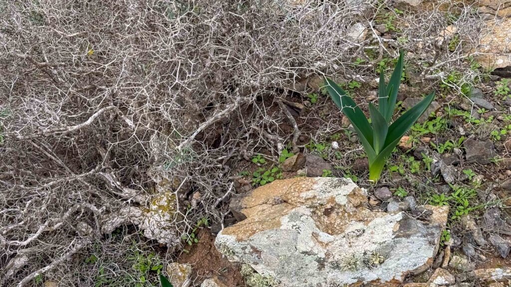 Während Karin telefonierte, ging ich den kleinen Weg um den Berg herum und beobachtete einen Raubvogel – vermutlich einen Mäusebussard, der hoch am Himmel stand und gelegentlich im Sturzflug zu Boden ging. Leider hielt er immer grosse Abstand. Die Fotos sind daher nicht sehr perfekt. In dem kargen Hang wuchsen auch irgendwelche Zwiebelgewächse – keine Blüte, daher können wir sie nicht einordnen.