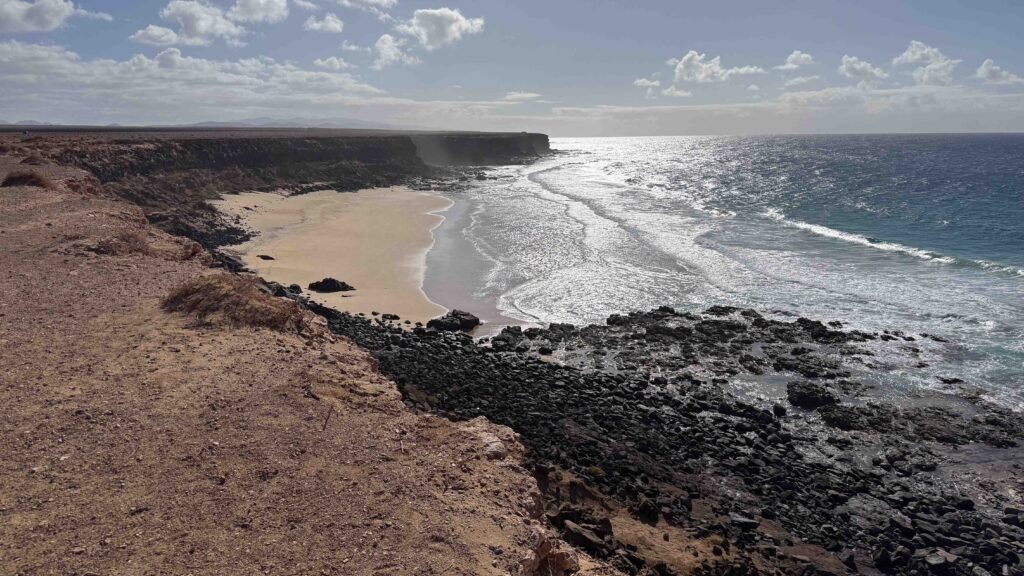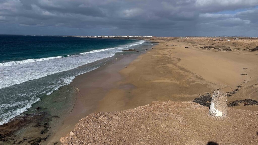 Vorher fuhren wir aber noch zu den Stränden im Süden von El Cotillo, die alle unterhalb von Steilhängen liegen und wegen Strömungen zum Baden kaum geeignet sind. Sie sind ein Eldorado für Surfer und Kiter. Wir standen also oben am Abhang und überlegten noch, ob wir runtergehen und uns etwas in die Sonne legen, da wechselte das Wetter, die Sonne verschwand hinter Wolken und wir beeilten uns zurück zum Auto zu gehen. Dort fuhr gerade ein Auto weg, das machte uns aber nicht misstrauisch (nächsten Beitrag lesen).
