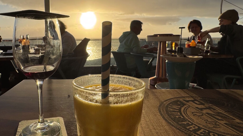 Es war inzwischen 15:30 Uhr und wir fuhren dann gleich zum Restaurant Nānā, zum Mittagessen. Es war Happy Hour, daher gab es 2 Gläser Rotwein für die Bestellung eines Glases. Karin trank einen heissen Tee und einen der beiden Rotweine. Pinsa andalusia und Burger schmeckten gut. Wir warteten bei einem weiteren Getränk den Sonnenuntergang ab und fuhren dann in unser „Verlies“.