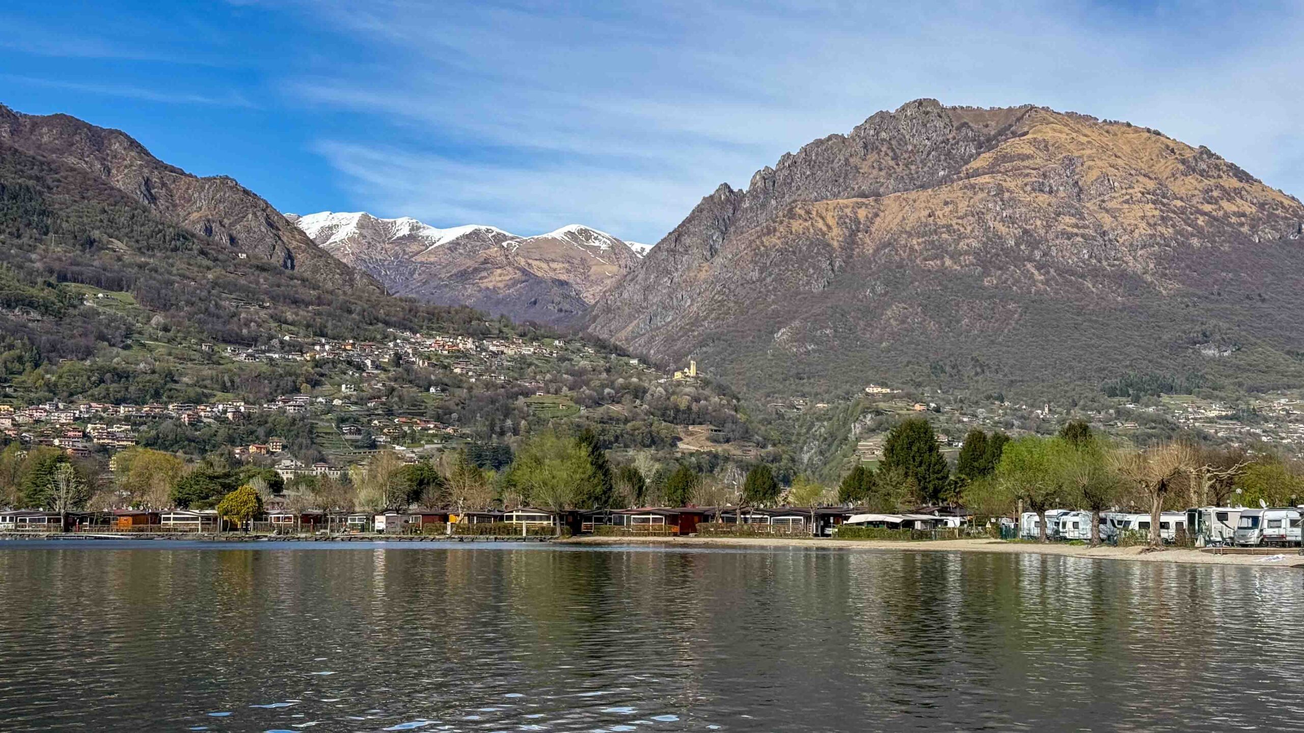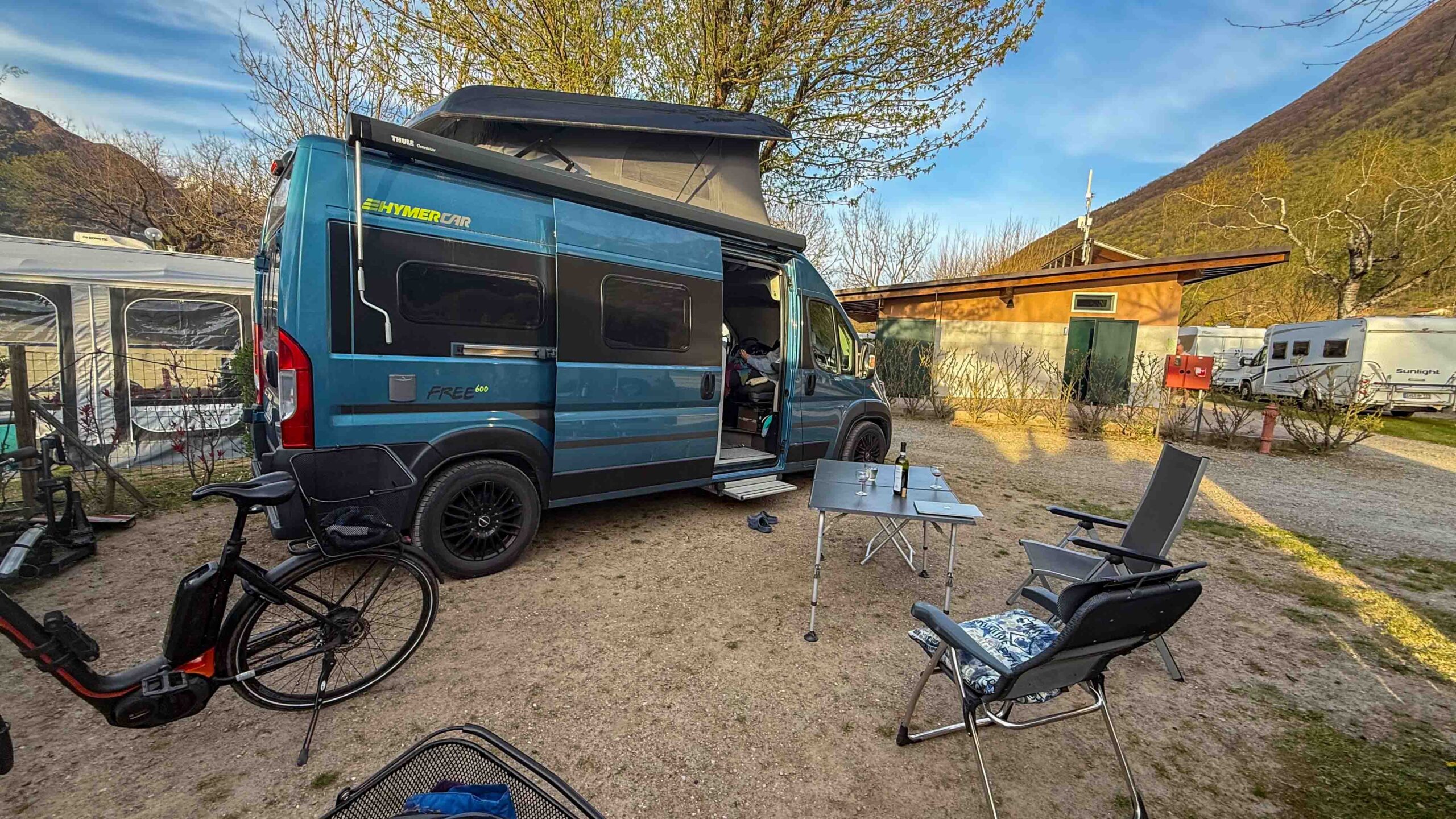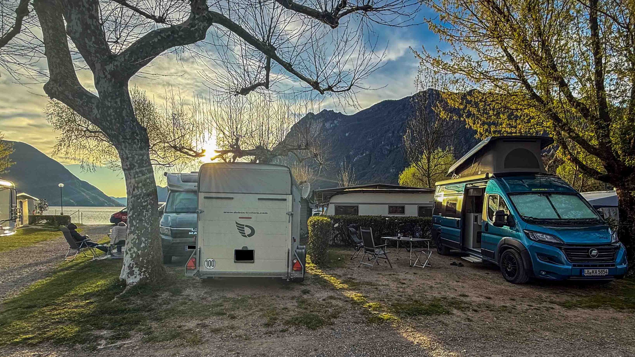 Im Bus war es empfindlich kalt geworden, obwohl ich die Truma-Gasheizung vor dem Schlafengehen auf 15 °C eingeschaltet hatte. Ein Fehler E 517 H war auf dem Display der Heizungssteuerung. Alle Versuche, den Fehler zu beseitigen, scheiterten und wir wollten auf dem Rastplatz auch nicht die Fahrräder abnehmen, um an den Schrank mit den Gasflaschen zu kommen. Also warfen wir den kleinen Elektro-Heizlüfter an, um annehmbare Temperaturen in Businneren zu erzeugen. Nach dem Frühstück ging es zurück auf die Autobahn. Ein WoMo, das unserem Bus sehr ähnlich aber auf Renault-Basis war, überholte uns. Wir fuhren auf Nebenstrasse durch Lugano und landten auf der Strasse Richtung Gandria, die am Ufer des Luganer Sees entlang führt. In Gandria überquerten wir die Grenze nach Italien und fuhren zum Camping Darna bei Porlezza. Der Camping liegt direkt am Seeufer, aber es gab keinen Platz in der ersten Reihe. So wählten wir den Platz 99 in der 3. Reihe, vielleicht 20 m vom Ufer entfernt.