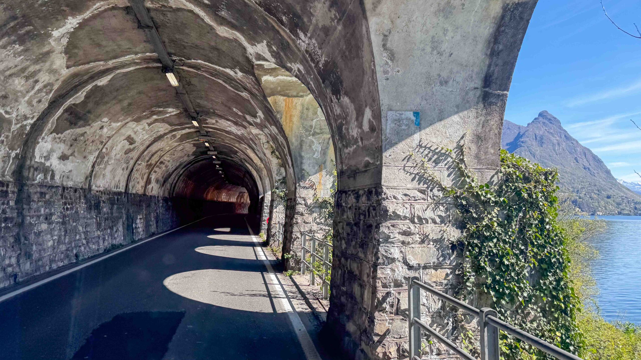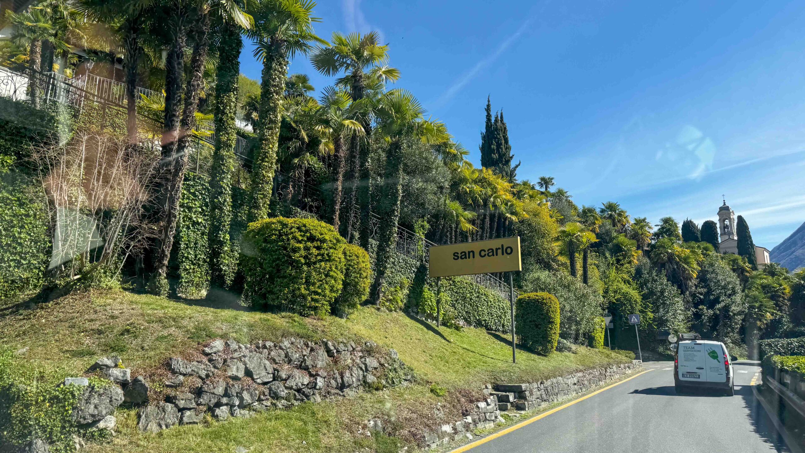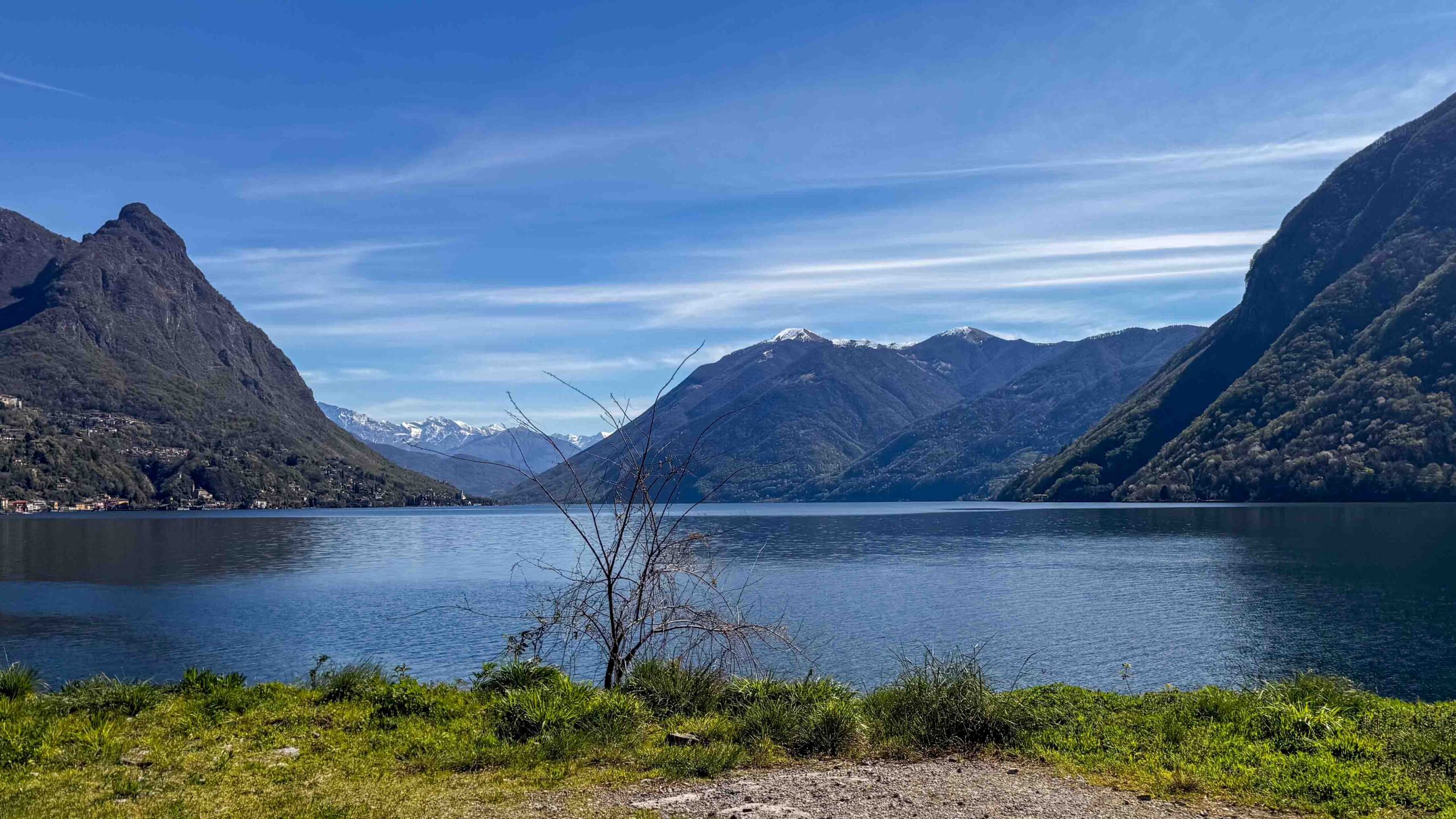 Im Bus war es empfindlich kalt geworden, obwohl ich die Truma-Gasheizung vor dem Schlafengehen auf 15 °C eingeschaltet hatte. Ein Fehler E 517 H war auf dem Display der Heizungssteuerung. Alle Versuche, den Fehler zu beseitigen, scheiterten und wir wollten auf dem Rastplatz auch nicht die Fahrräder abnehmen, um an den Schrank mit den Gasflaschen zu kommen. Also warfen wir den kleinen Elektro-Heizlüfter an, um annehmbare Temperaturen in Businneren zu erzeugen. Nach dem Frühstück ging es zurück auf die Autobahn. Ein WoMo, das unserem Bus sehr ähnlich aber auf Renault-Basis war, überholte uns. Wir fuhren auf Nebenstrasse durch Lugano und landten auf der Strasse Richtung Gandria, die am Ufer des Luganer Sees entlang führt. In Gandria überquerten wir die Grenze nach Italien und fuhren zum Camping Darna bei Porlezza. Der Camping liegt direkt am Seeufer, aber es gab keinen Platz in der ersten Reihe. So wählten wir den Platz 99 in der 3. Reihe, vielleicht 20 m vom Ufer entfernt.