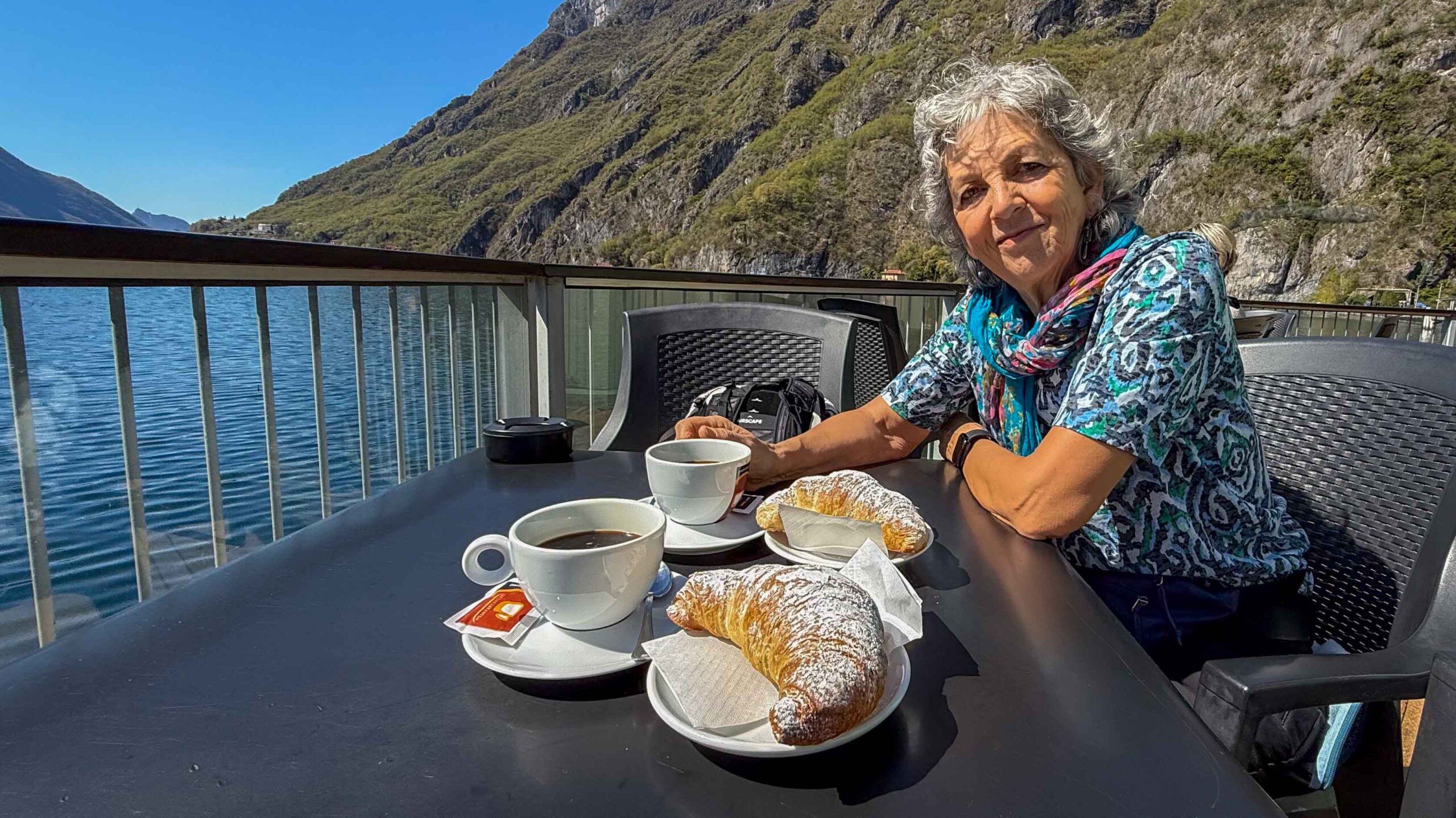 Nach einem kleinen Spaziergang am Seeufer aßen wir unser von zuhause mitgebrachtes Mittagessen und als Nachtisch die köstlichen italienischen Käse, die wir gerade gekauft hatten. Als die Sonne hinter den Bergen verschwand, wurde es schnell so kühl, dass wir es vorzogen uns in den Bus zurückzuziehen.