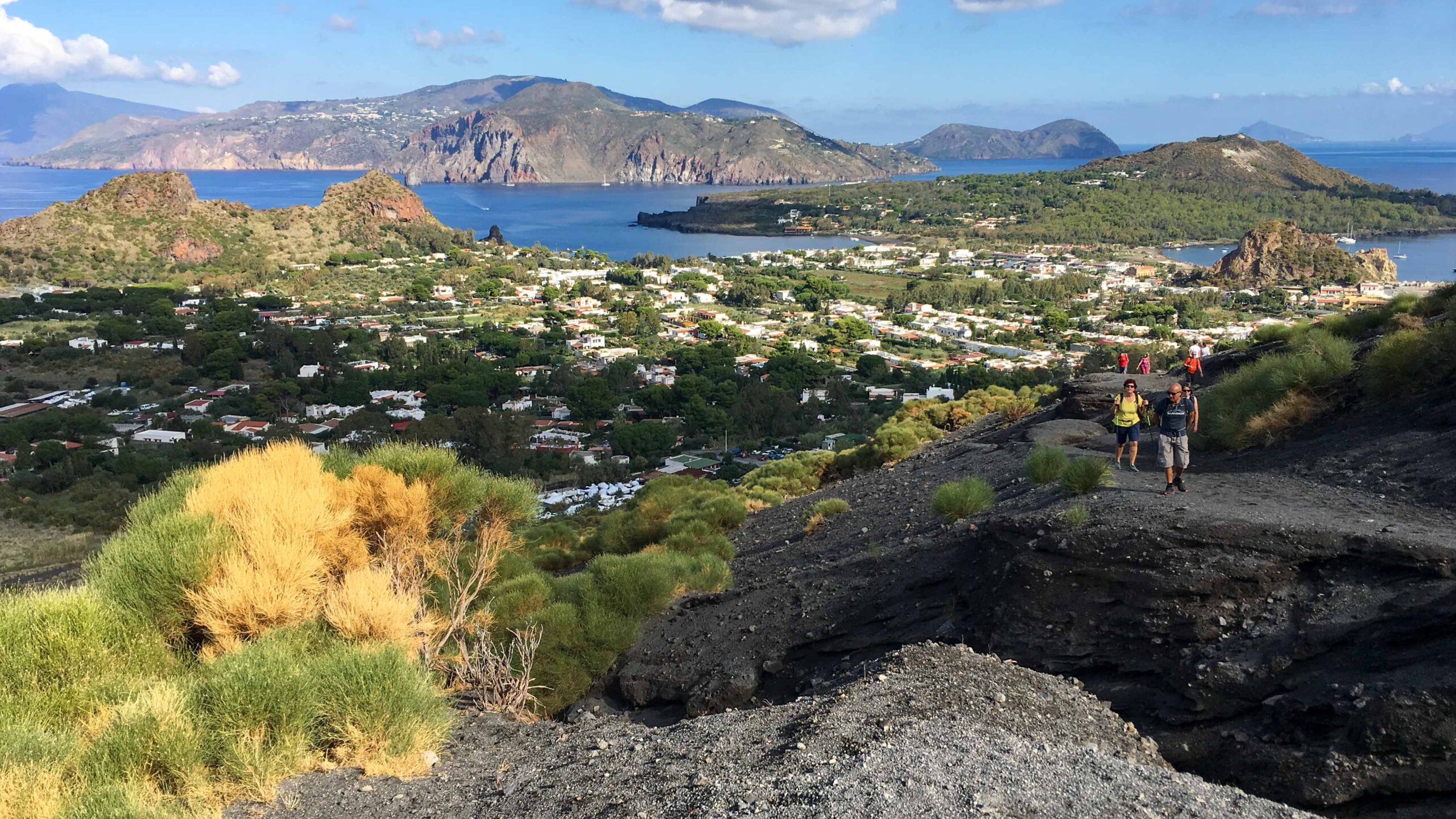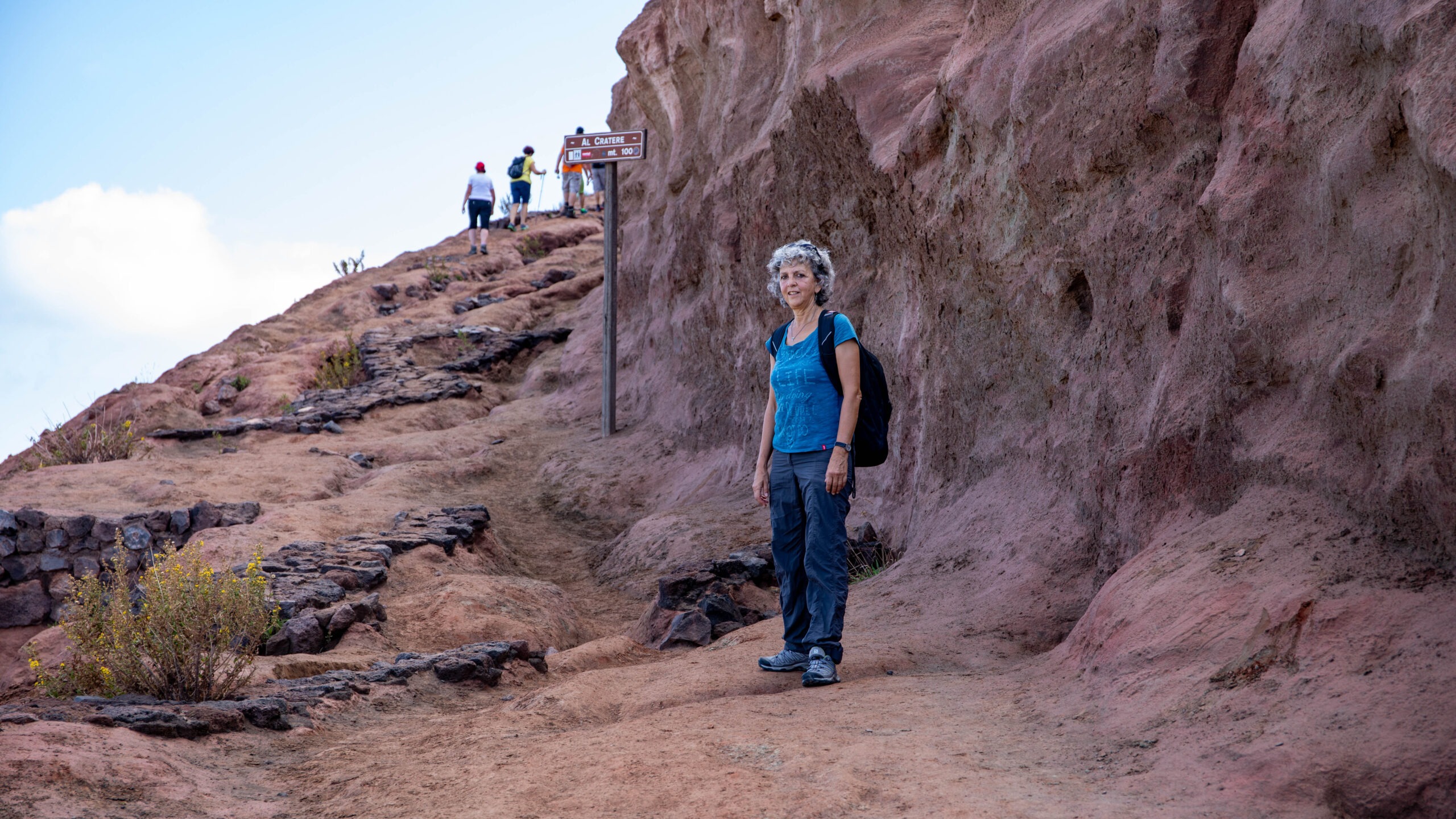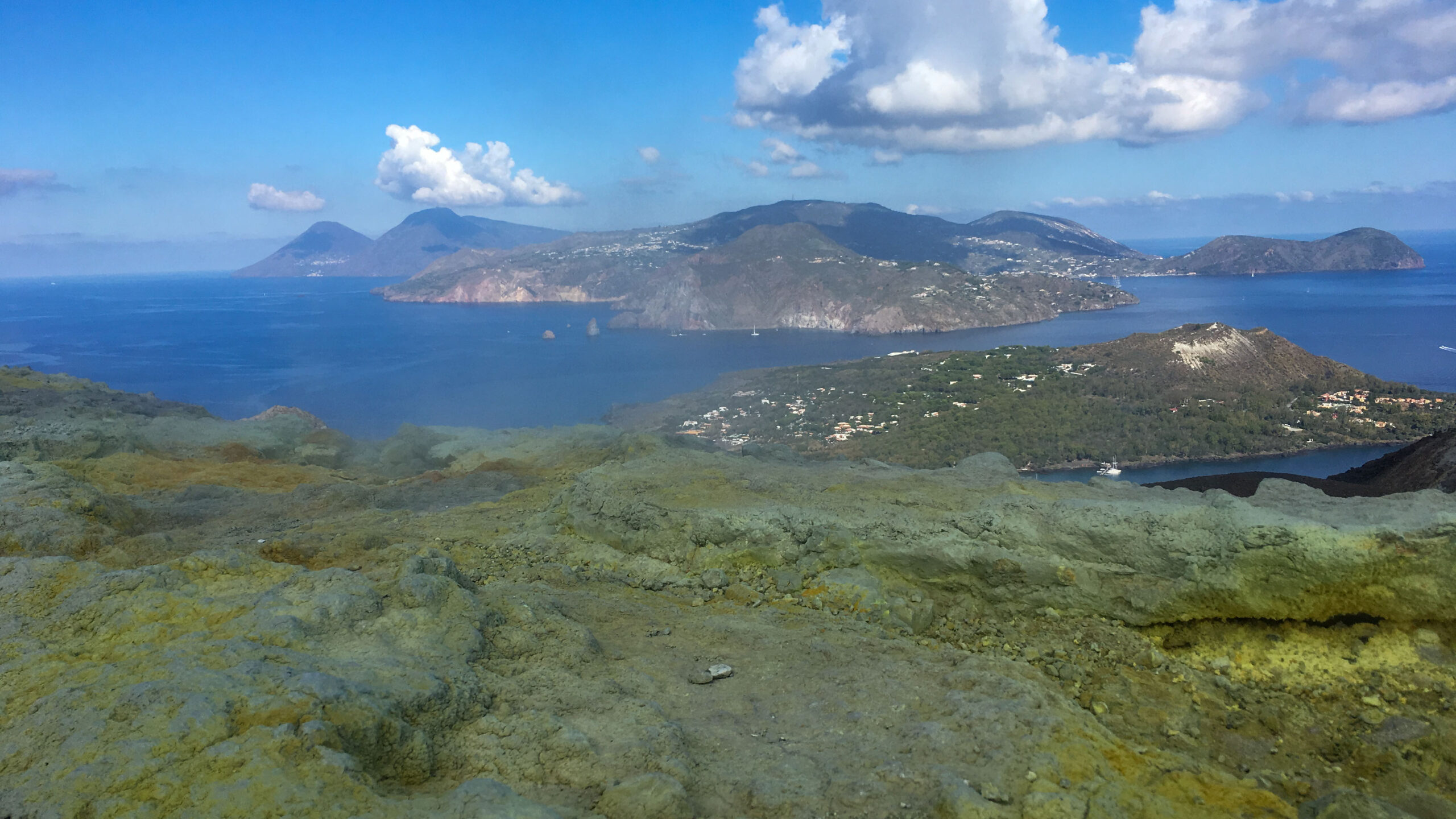 Am 13. Oktober setzten wir nach Vulcano über. Bei der Ankunft im Hafen roch es deutlich nach Schwefelwasserstoff. Wir überlegten, wie man bei diesem Gestank nach faulen Eiern auf dieser Insel Urlaub machen kann. Wir orientierten uns schnell und wanderten zum ausgeschilderten Aufgang zum recht aktiven Vulkan. Die letzte Eruption war 1888 – 1890, aber Vulkanologen erwarten bald einen neuen Ausbruch. Wir waren nicht allein unterwegs, denn schon am Anfang des Aufstiegs beobachteten wir einige Touristen mit teils ungeeignetem Outfit. Der Weg hoch zum Gran Cratere (390 m Höhenmeter) war teilweise steil, aber gut zu bewältigen.
