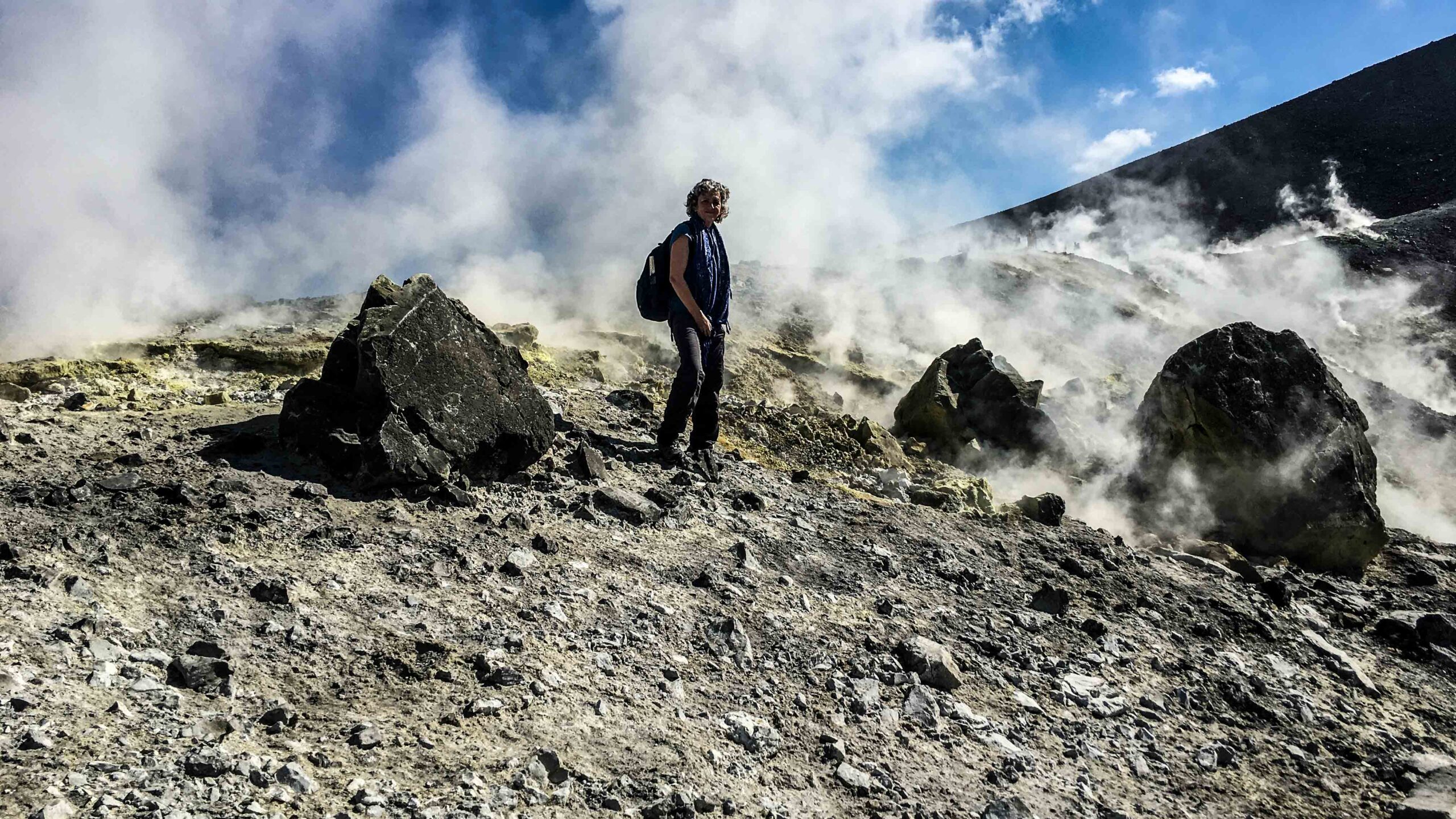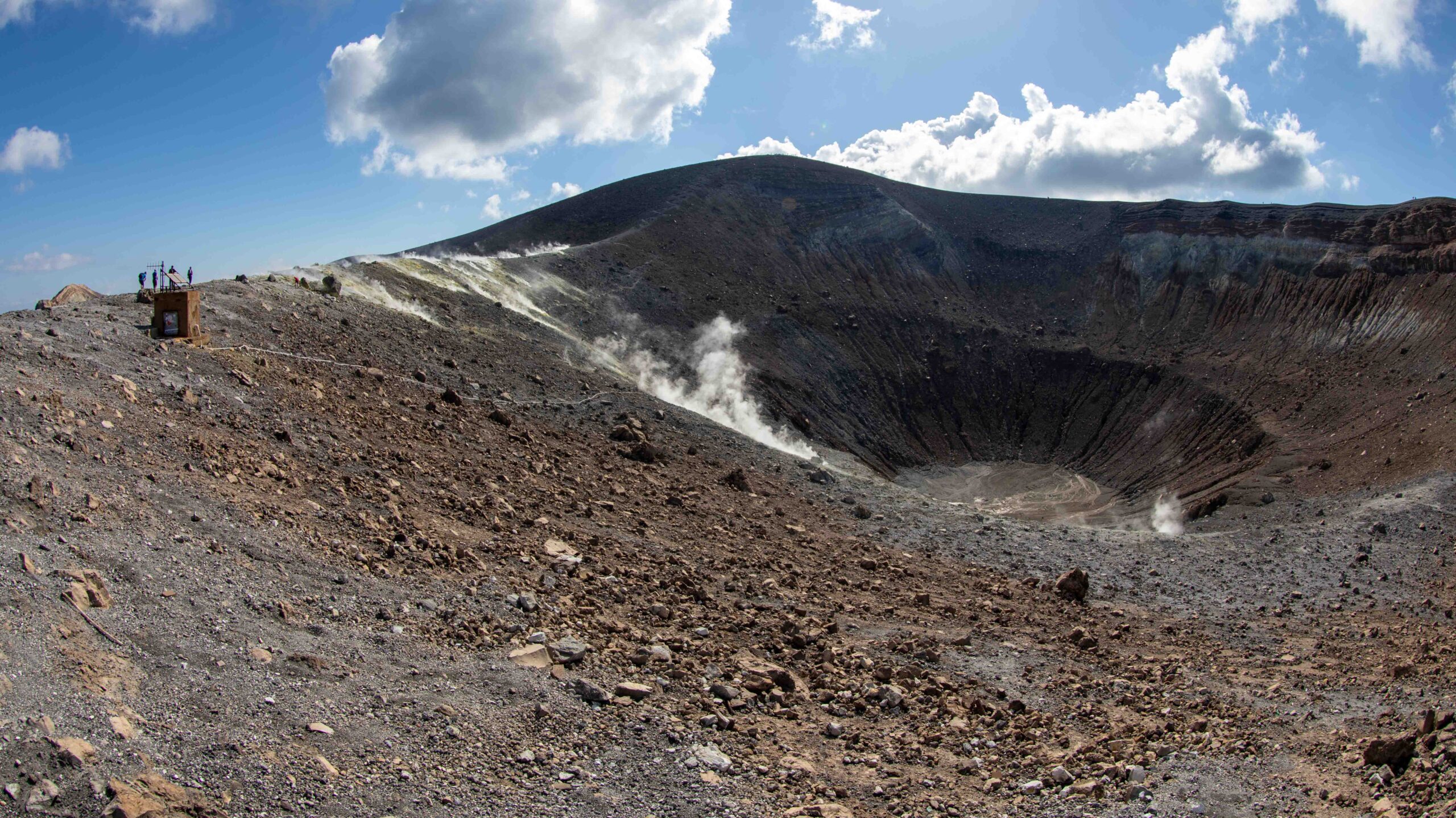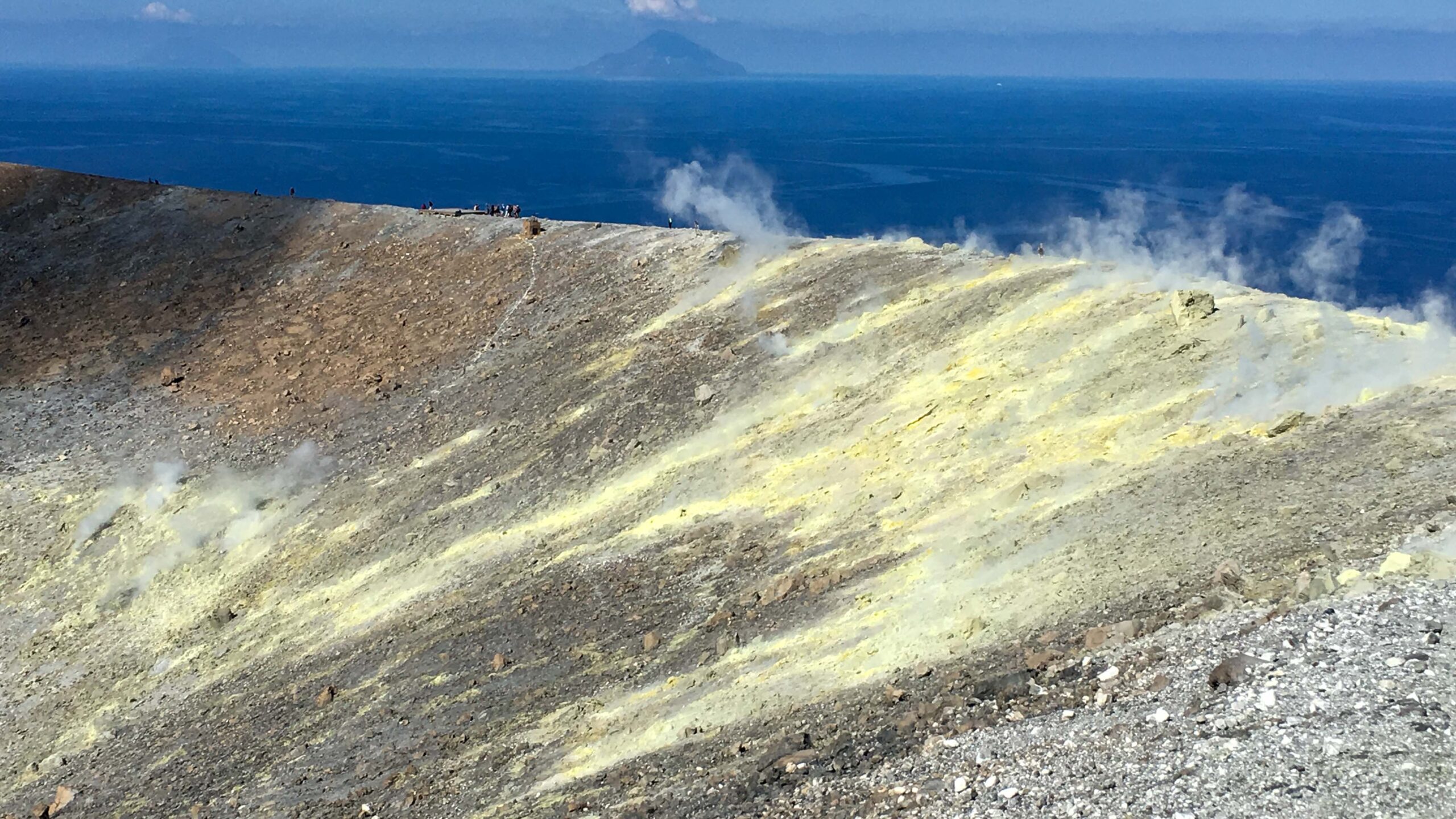 Auf dem Vulkan rauchte es und der Gestank wechselte zu Schwefeldioxid. An vielen Stellen war der Kraterrand mit elementarem Schwefel bedeckt. Die Ausmaße des Kraters verdeutlichen die kleinen Punkte, die andere Besucher darstellen. Ein geführte Gruppe tauchte aus dem Rauch auf, die sich durch Masken vor dem Schwefeldioxid schützen und eine Kraterumrundung machen wollten. Manche Touristen gingen auch die Abhänge zum Krater hinunter.