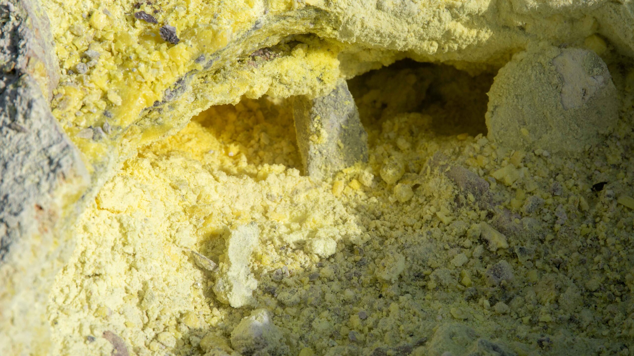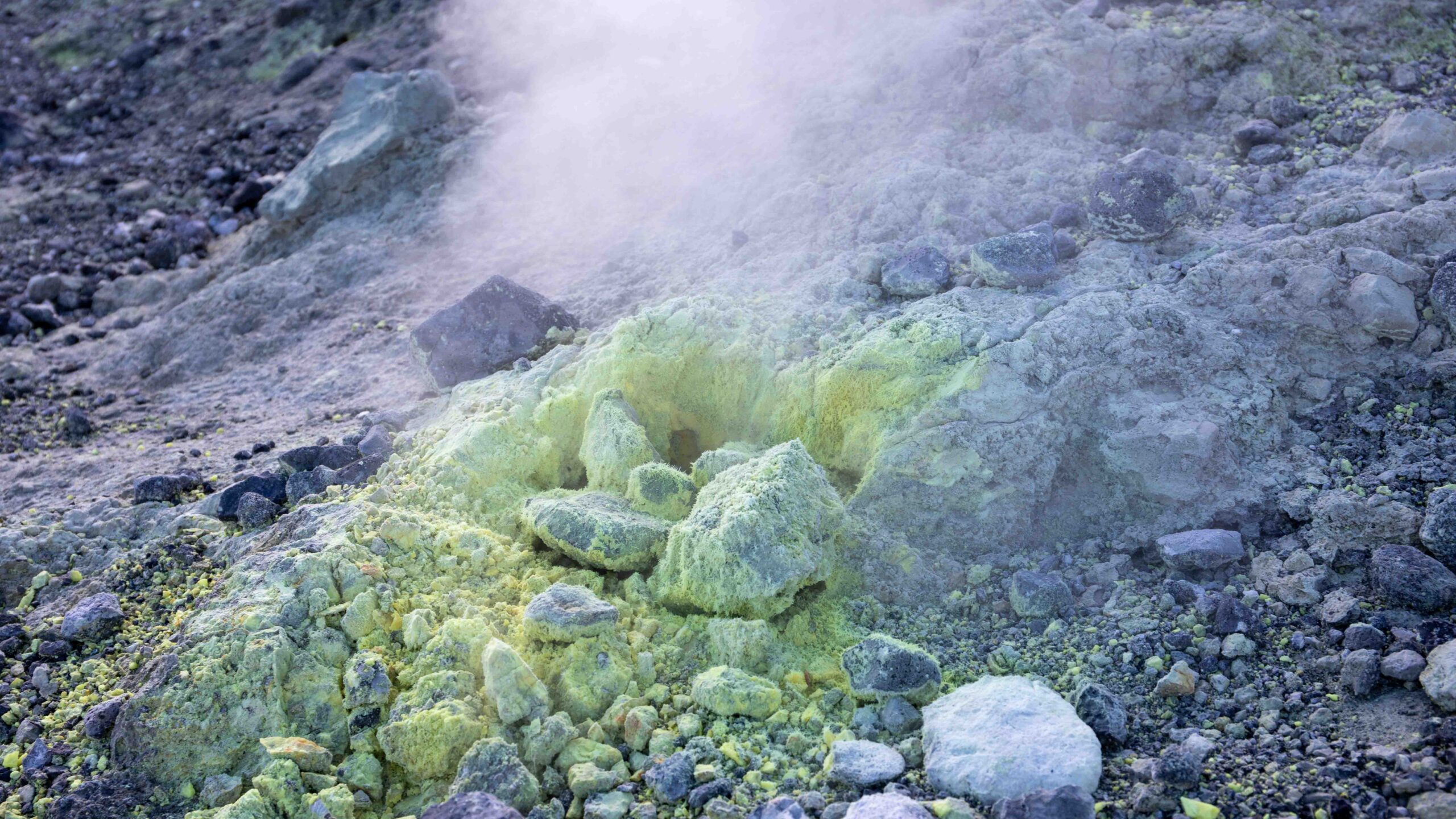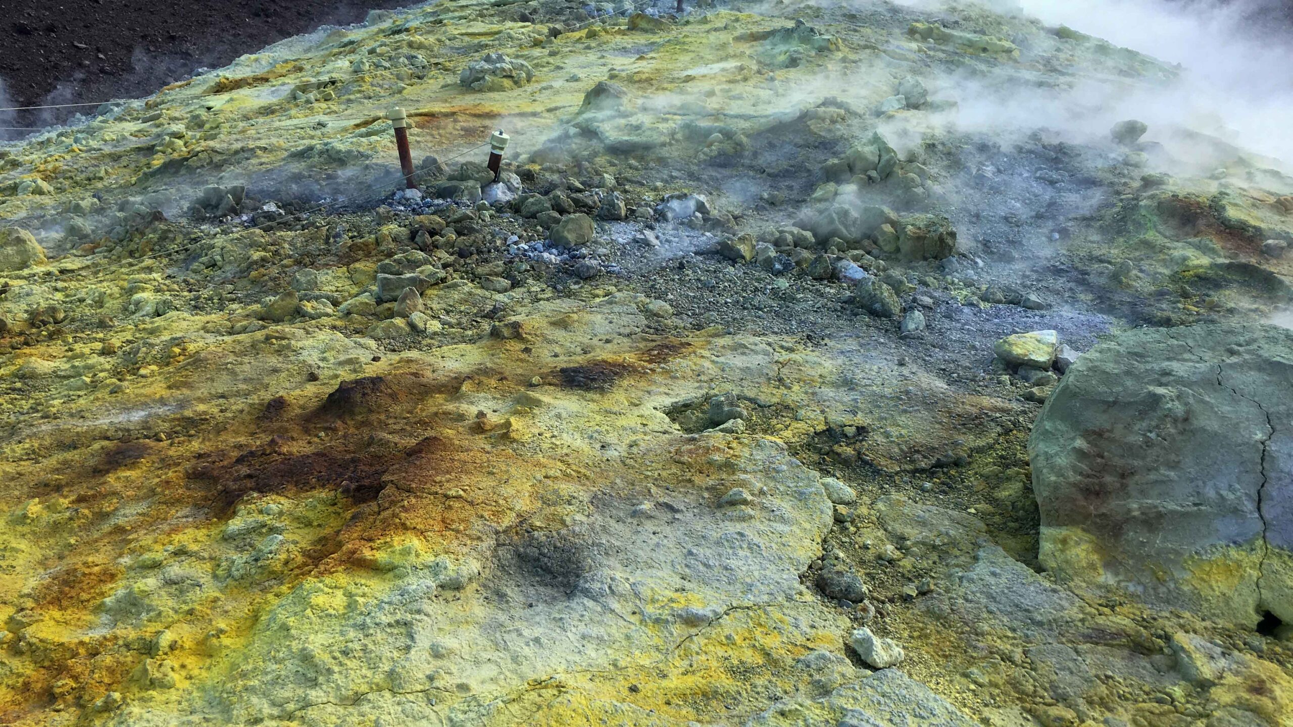 Auf dem Vulkan rauchte es und der Gestank wechselte zu Schwefeldioxid. An vielen Stellen war der Kraterrand mit elementarem Schwefel bedeckt. Die Ausmaße des Kraters verdeutlichen die kleinen Punkte, die andere Besucher darstellen. Ein geführte Gruppe tauchte aus dem Rauch auf, die sich durch Masken vor dem Schwefeldioxid schützen und eine Kraterumrundung machen wollten. Manche Touristen gingen auch die Abhänge zum Krater hinunter.