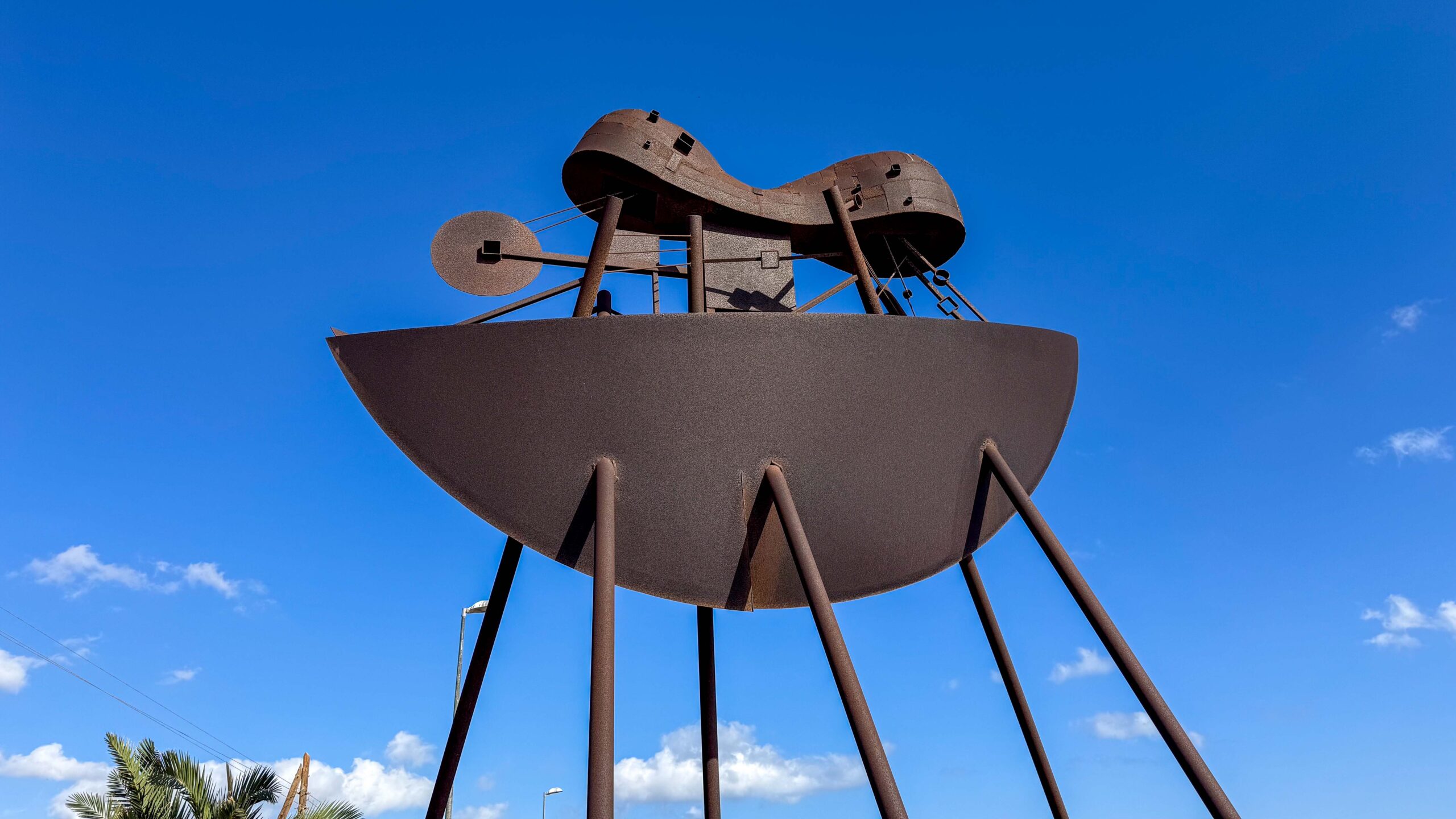 Vom Hügel gab eine schönen Blick auf den Strand und das Dorf, aber auch auf den nachfolgenden Strand, an dem nur ein paar Autos standen. Am Ende der Strandpromenade thronte noch ein Kunstwerk.