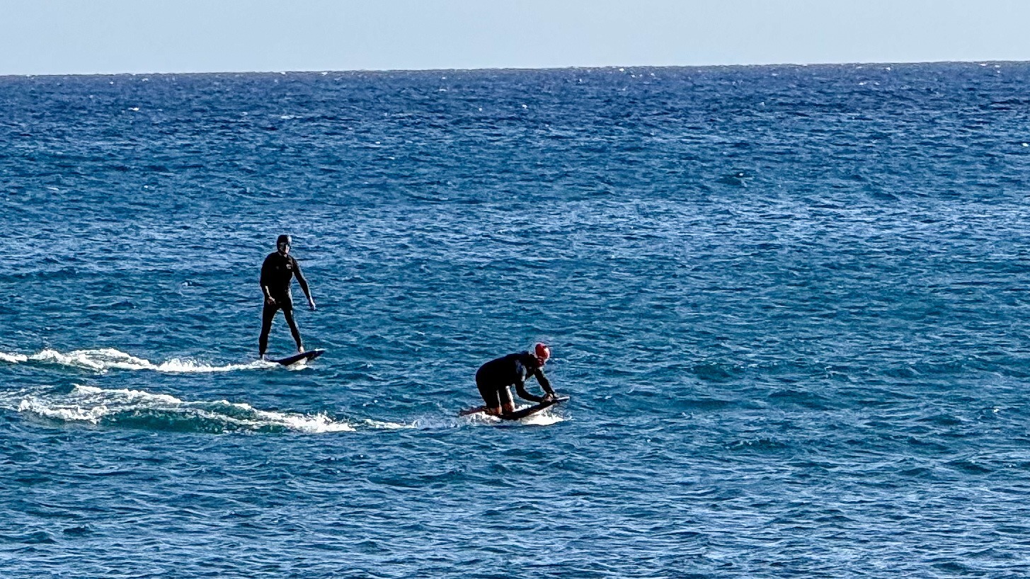 Alles sehr unspektakulär, wären da nicht 2 Audi e-tron foil performance boards aufgebaut worden. Es handelte sich wohl um einen Surflehrer und 2 Schülern. Die Fahrer zogen Neoprenanzüge mit Rückenschutz an und jeder hatte einen Helm auf. Der Lehrer stand nach ein paar Metern auf dem Board, während der etwas ältere Herr ziemlich Mühe hatte und häufiger ins Wasser plumpste. Scheint nicht so einfach zu sein, wie es aussieht. Wir sassen bestimmt eine Stunde auf einer Bank und schauten zu, während wir in der Sonne brutzelten. Die Boards (jedes kostet mehr als 12 000 €) hatten einen Unterwasser-Jetantrieb, der über einen Hand-Controller gesteuert wird. Sie flitzen mit bis zu 50 km/h übers Wasser.