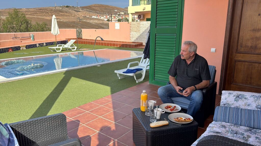 Morgen kurz nach der Dusche wurden wir von Julian überrascht. Er hatte heute Geburtstag und rief an, weil er nachmittags schlecht erreichbar war. Er hatte inzwischen seinen Job gekündigt und fängt am 1. Januar bei seine neuen Firma an. Dann gab es Frühstück am Sitzplatz vor unserem Wohnzimmer.