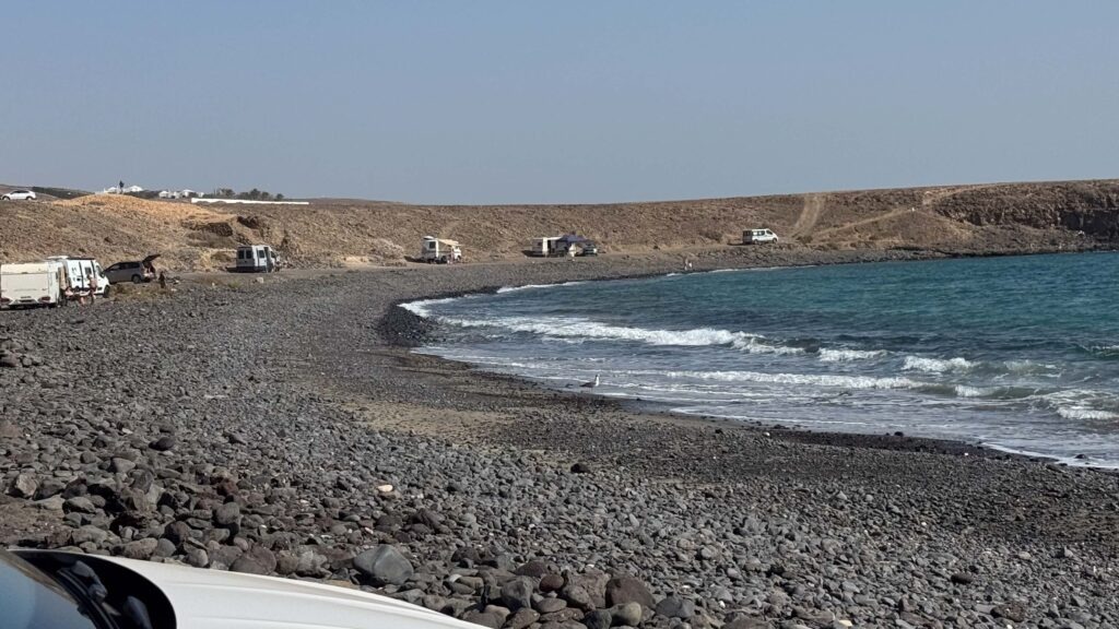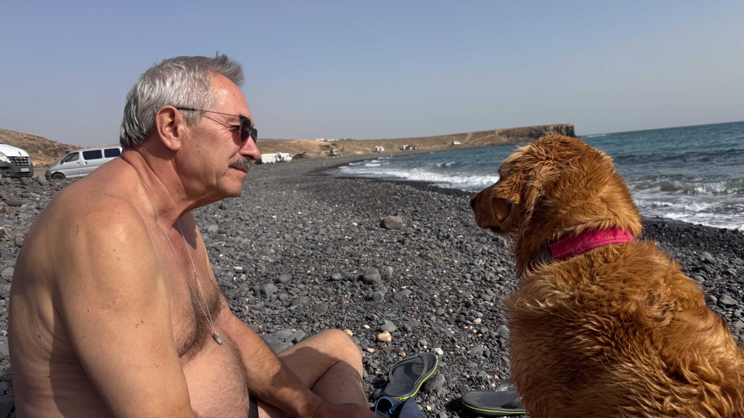 Vom Markt aus fuhren wir zum Playa de la Jaqueta, an dem nur ein paar Wohnmobile rumstanden. Wir gingen ins klaren Wasser und badeten 2 Mal. Es war einfach herrlich von den Wellen geschaukelt zu werden. Am Strand bekamen wir Besuch von einem Hund, der zu einem Wohnmobil aus der Slowakei gehörte. Er war echt zutraulich.