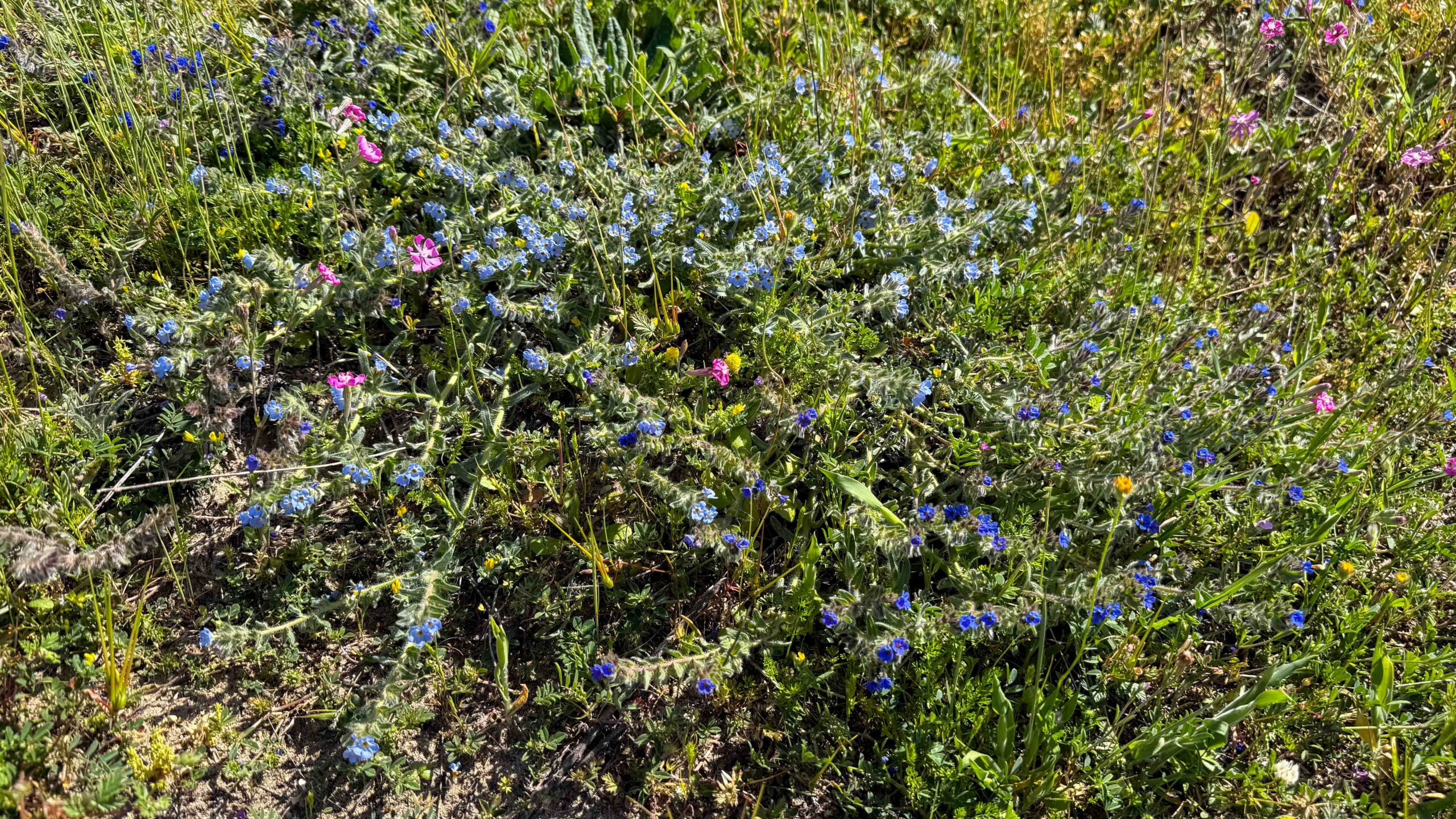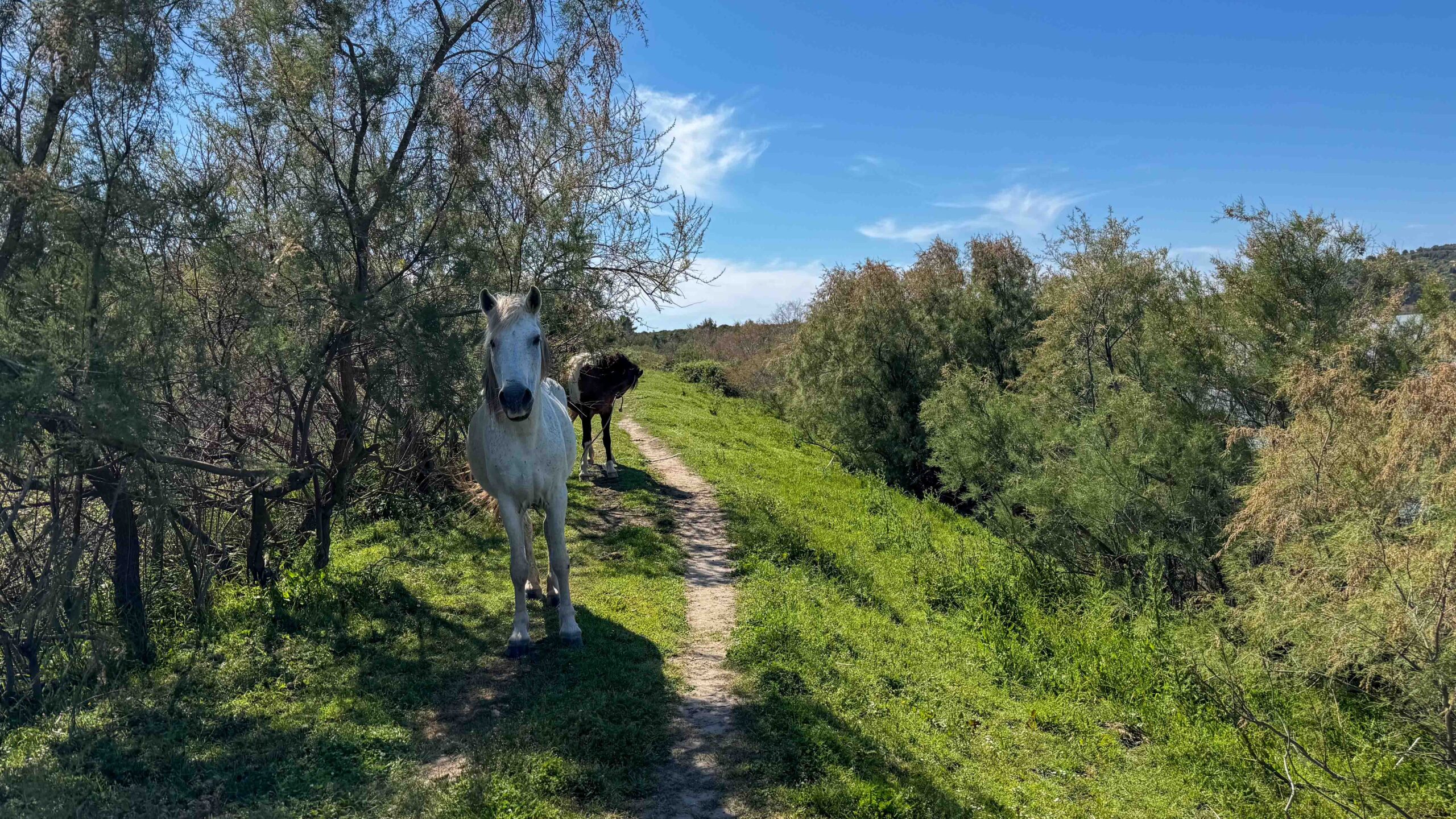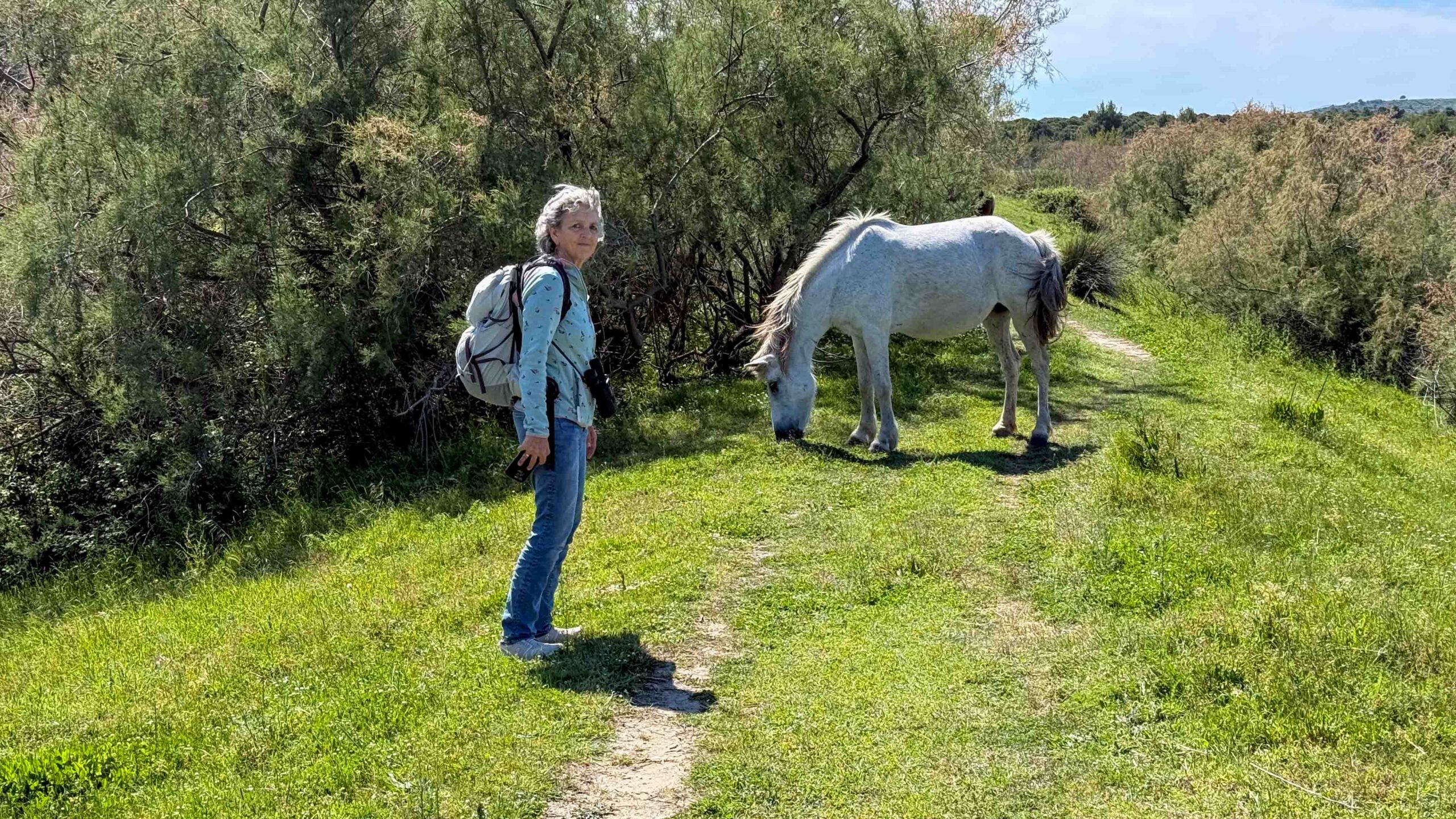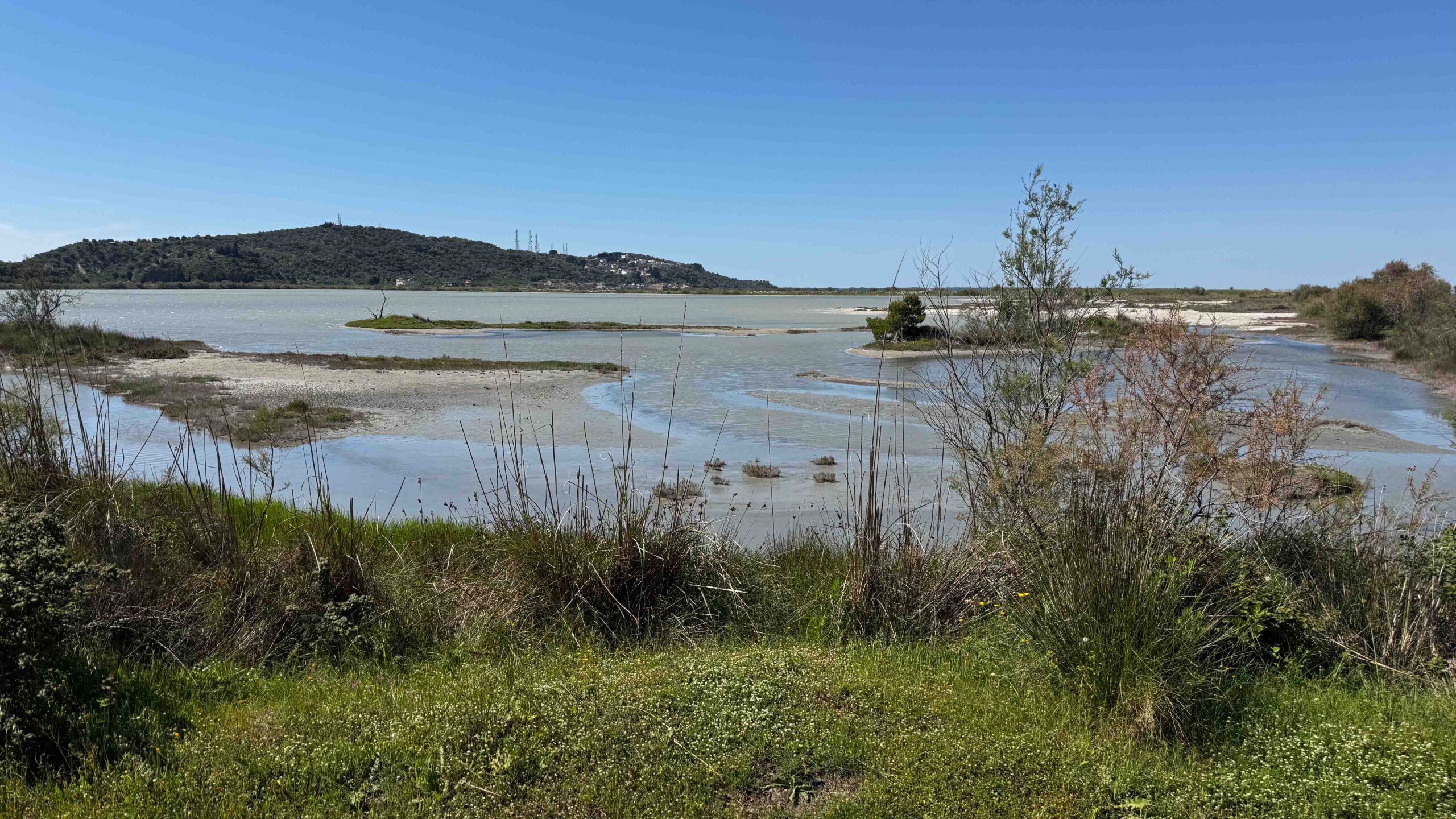 Wir tranken einen Espresso in der „Bar“ und gingen dann auf Erkundigung an die Lagunen. Allerdings gab es nur ein paar weisse Reiher zu sehen. Flamingos waren auf der anderen Seite der Lagune, auch mit dem Fernglas nur schwer identifizierbar. Mal abwarten, vielleicht sind sie heute Abend näher. Auf dem Weg grasten 2 Pferde, die uns neugierig beäugten und die Wegränder waren voller blauer und violetter Blumen und verschiedene Distelarten.