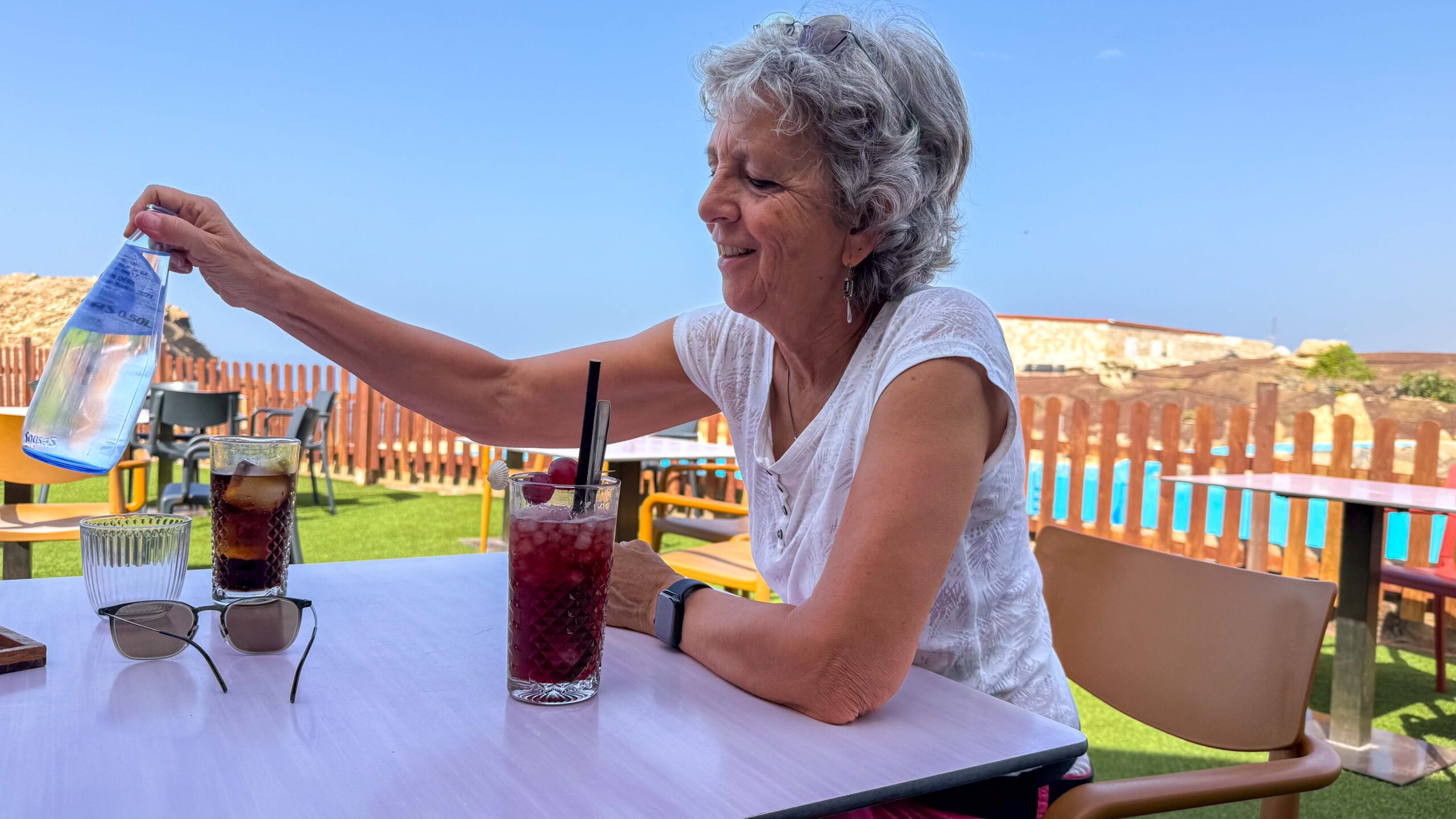 Wir gingen im Caretta Beach essen. Wir waren ja schon einmal am Samstag/Sonntag da, aber das waren Ruhetage. Heute hatten wir mehr Glück und bekamen zum Glück noch ein Schattenplätzchen. Karin aß „Pimientos de Padron“, da das vegetarische Essen heute nicht erhältlich war und ich bekam einen leckeren Burger mit Pommes Frites, die eigentlich Karin bestellt hatte. Sangria, Wasser und Kola. Das Restaurant hatte sogar einen gerade leeren Pool. Keine Ahnung, was sie damit machen, denn es gibt keine Zimmer zu mieten. Vielleicht Pool-Parties für Surfer ?