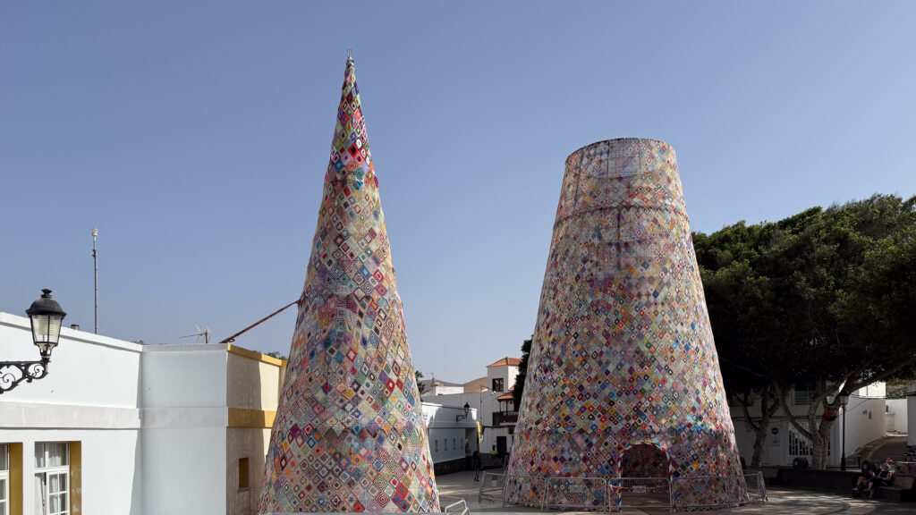 Wir fuhren weiter nach Pájara, der Ort an dem wir vor ca 10 Tagen den Turm fotografiert hatten, der aus lauter gehäkelten Quadraten zusammengesetzt war. Inzwischen war das Ensemble um eine Pyramide erweitert worden und das kleine Zwischenstück war auf den Basisturm gesetzt worden. Wir nehmen an, dass die Spitze noch auf den Basisturm aufgesetzt wird.