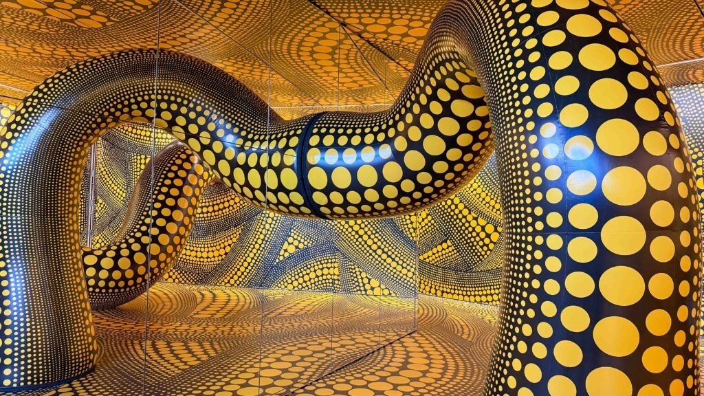 Dank unseres Museumspasses konnten wir an der Kasse vorbei direkt ins Museum gehen. Anstatt erst die Ausstellung zu besichtigen, gingen wir ins Untergeschoss, um die dortige Installation anzuschauen. Auch dort eine überschaubare Warteschlange, bevor wir wieder einen Spiegelkubus betreten dürfen, in dem gelb gepunktete Säulen aufgeblasen waren. Die Decke waren ebenfalls Spiegel. Karin nutzte das, um ein paar Aufnahmen aus ungewöhnlicher Perspektive zu machen. Der gesamte Raum ausserhalb des Kubus war mit diesem Ornamant verkleidet, selbst die Überwachungskamera bekam den Überzug.