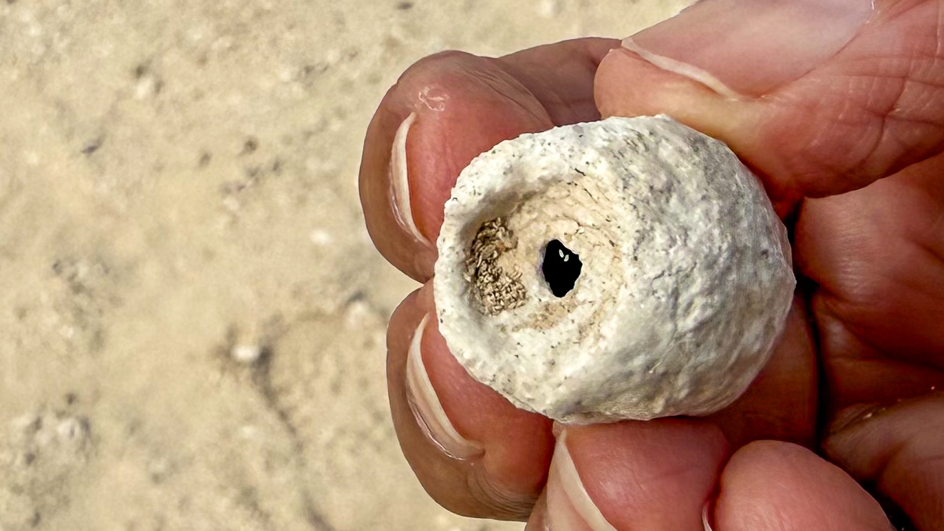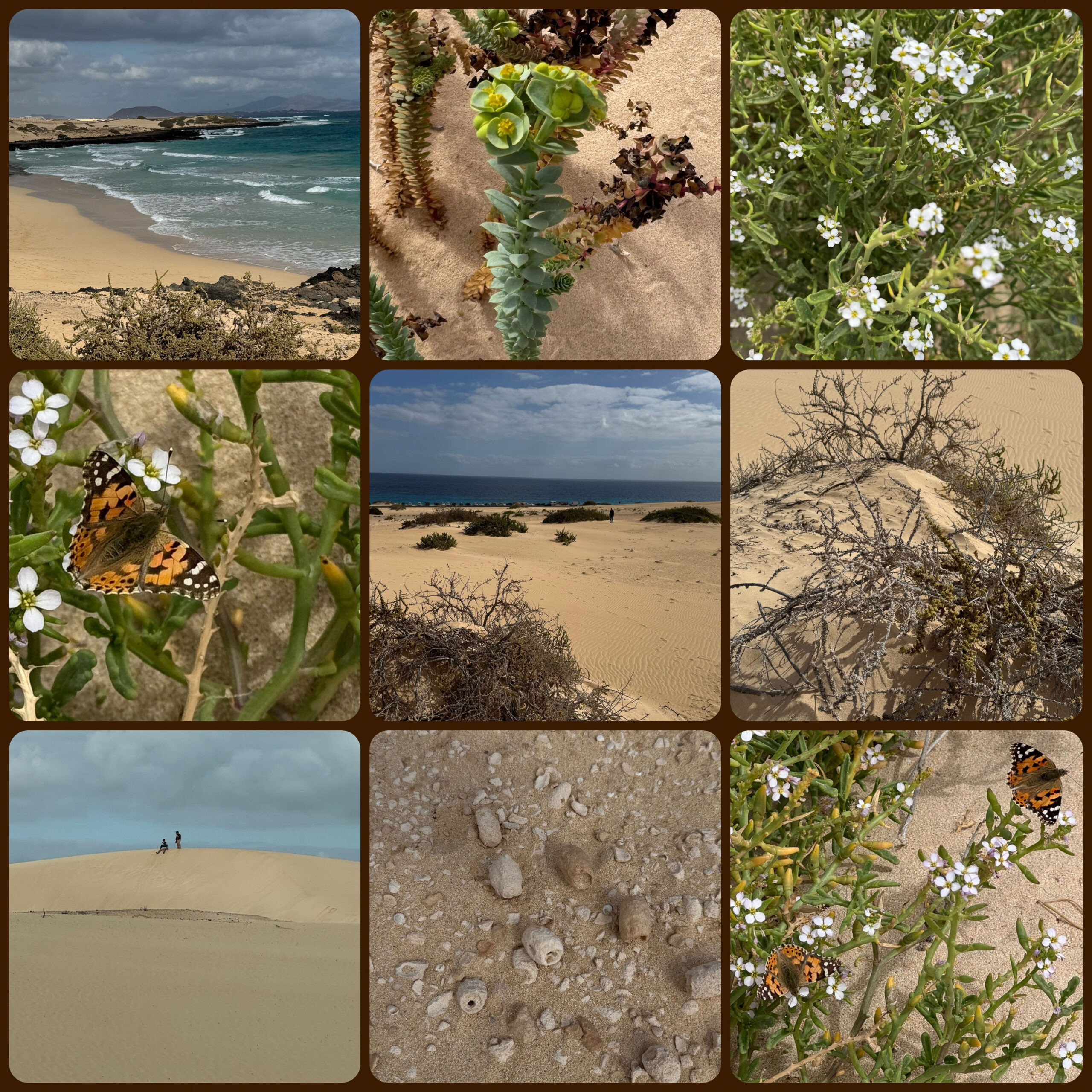 Es ging weiter Richtung Corralejo, so gut es ging am Meer entlang. Zum ersten Mal sahen wir Surfer auf dem Wasser, die angesichts des Windes superschnell vorankamen, alles Könner. Die Strände waren aber ziemlich felsig. Erst als wir in die Dünen kamen, waren Sandstrände. Wegen der Wellen und dem starken Wind, der ungemütlich kalt machte – es waren auch wieder dunkle Wolken aufgezogen – sahen wir vom Baden ab, obwohl wir an einem Traumstrand waren – vielleicht morgen ? Stattdessen gingen wir in die Dünen, in denen schon einige Paare Selfies und Videos für ihren Online-Auftritt anfertigten. An einer Stelle fielen uns kleine Kokons aus Sand auf, die Löcher hatten – vielleicht nutzt ein Insekt diese Möglichkeit zum Eier ausbrühten. Die Wüste war auch nicht ohne Pflanzen, einige grosse Büsche mit Sukkulenten und sogar Blumen, die von Schmetterlingen angeflogen wurden, waren zu sehen.
