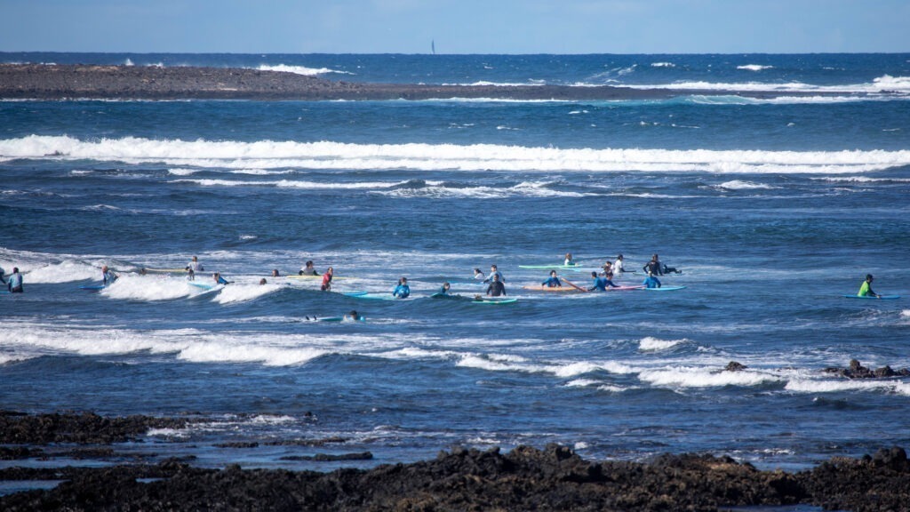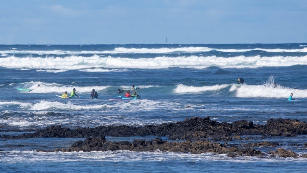 Wir beschlossen heute morgen am Haus zu bleiben und mal den Pool zu geniessen. Wenn man gegen Nachmittag von Aktivitäten zurückkommt, liegt der Pool im Schatten und der Wind macht es dann ungemütlich im Pool baden zu gehen. Das haben wir nicht geschafft, nach etwa einer Stunde saßen wir wieder im Auto und fuhren nach Majanicho. Dort nahmen wir nicht die Strecke nach El Cotillo, sondern es ging Richtung Norden – Richtung Corralejo. Der Feldweg führte vorbei an einigen „Stränden“ – keine Sandstrände, sondern felsige Küste an der Surfschulen ihre Schüler unterrichteten. An einem Strand war regelrecht Überfüllung, so viele Surfer tummelten sich im Wasser.