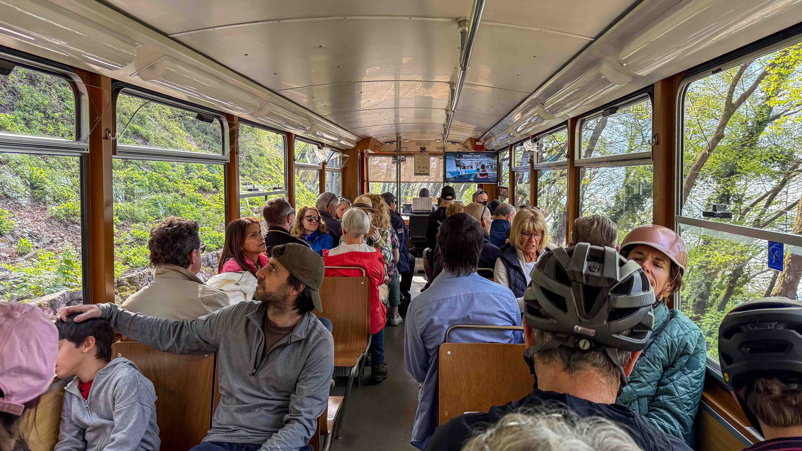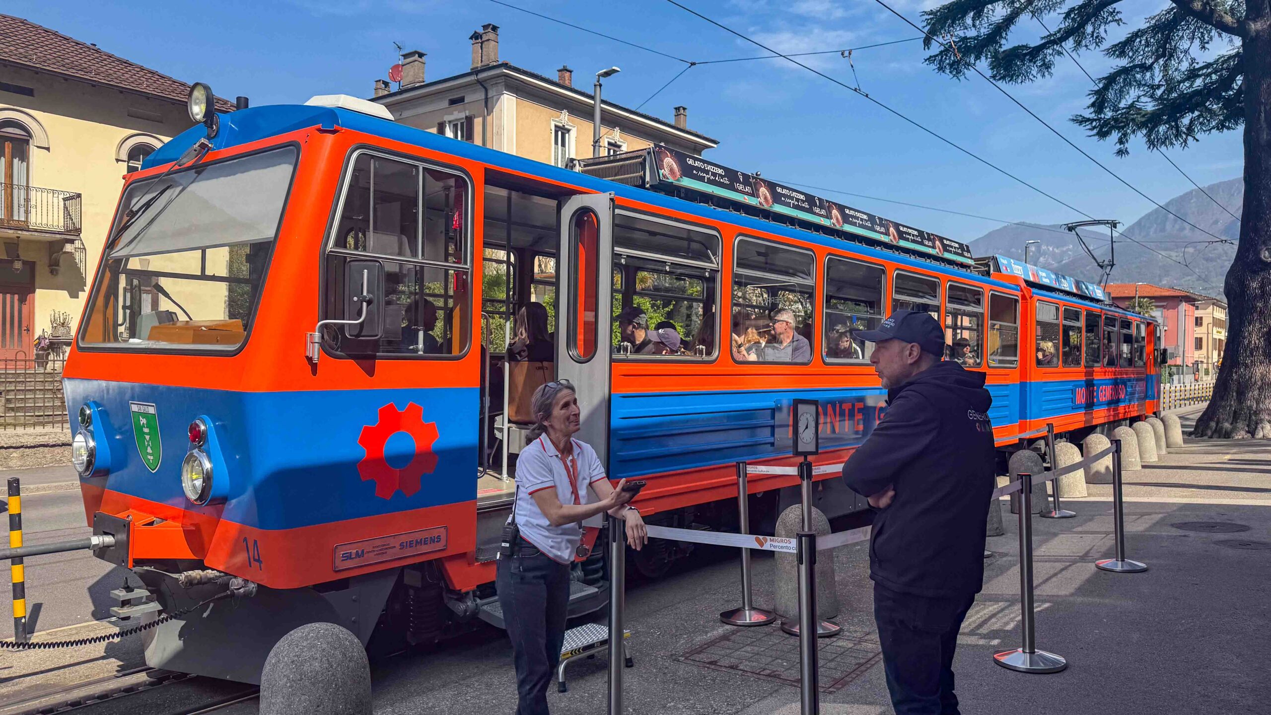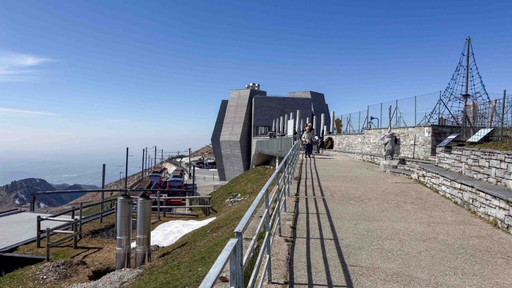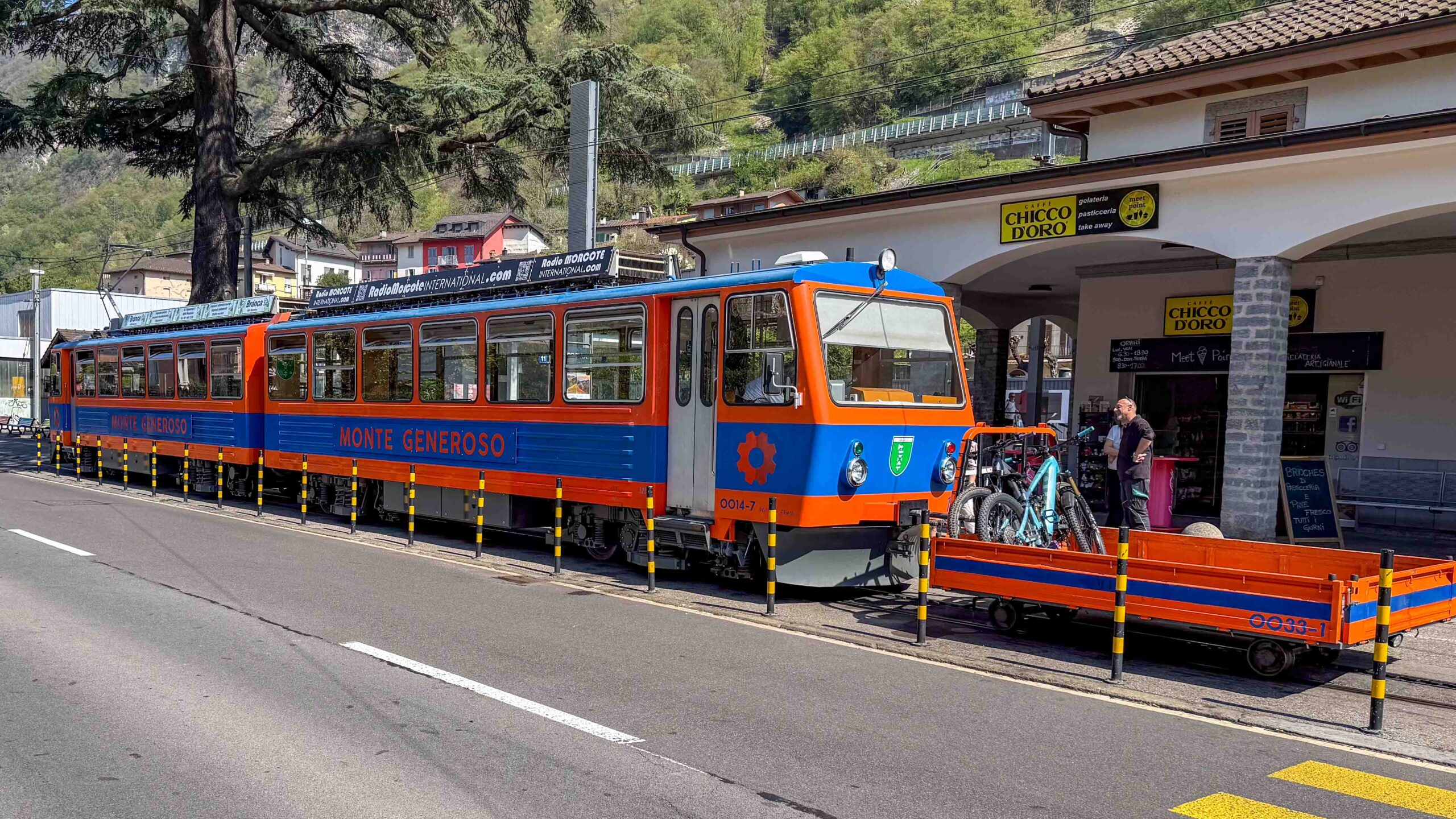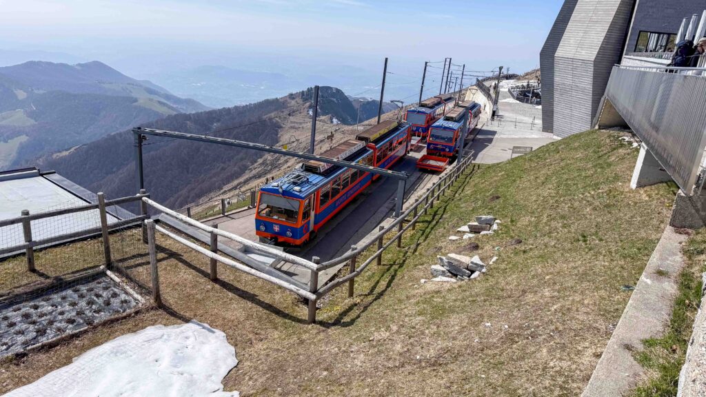 Wir wollten ursprünglich zu Parkplatz Bellavista, aber ein Schild zeigte uns den Weg zu einem Parkplatz, der als Monte Generoso ausgeschildert war. Ich fragte einen Passanten und er sagte uns, dass der Zug in 15 Minuten am Bahnhof abfährt. Der Bahnhof wäre nur 100 m entfernt. Also parkten wir schnell, packten unsere wärmeren Sachen und gingen los. Der Zug startete wenige Minuten später und im Preis der Tickets war ein Mittagessen mit Getränke (kostete nur 3 CHF mehr als das reguläre Bahnticket) in der Bergstation enthalten. Die Berg- und Talfahrt für uns beide und mit 2 Mittagessen kostete dann 114 CHF. Stolzer Preis, im Sommer kostet die Fahrt sogar 144 CHF (ohne Mittagessen). Die Bahn war ziemlich voll besetzt und die Fahrt bis zur Bergstation dauerte etwa 35 Minuten. Am Anfang des Zugs befand sich ein Wagen, mit dem Mountainbikes und Gleitschirme befördert wurden.