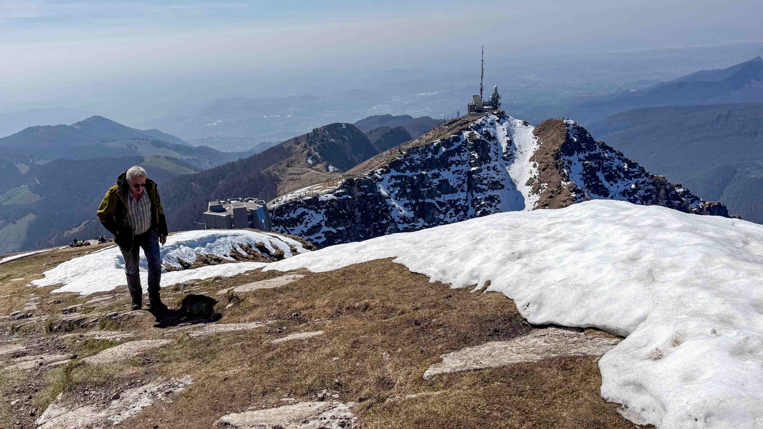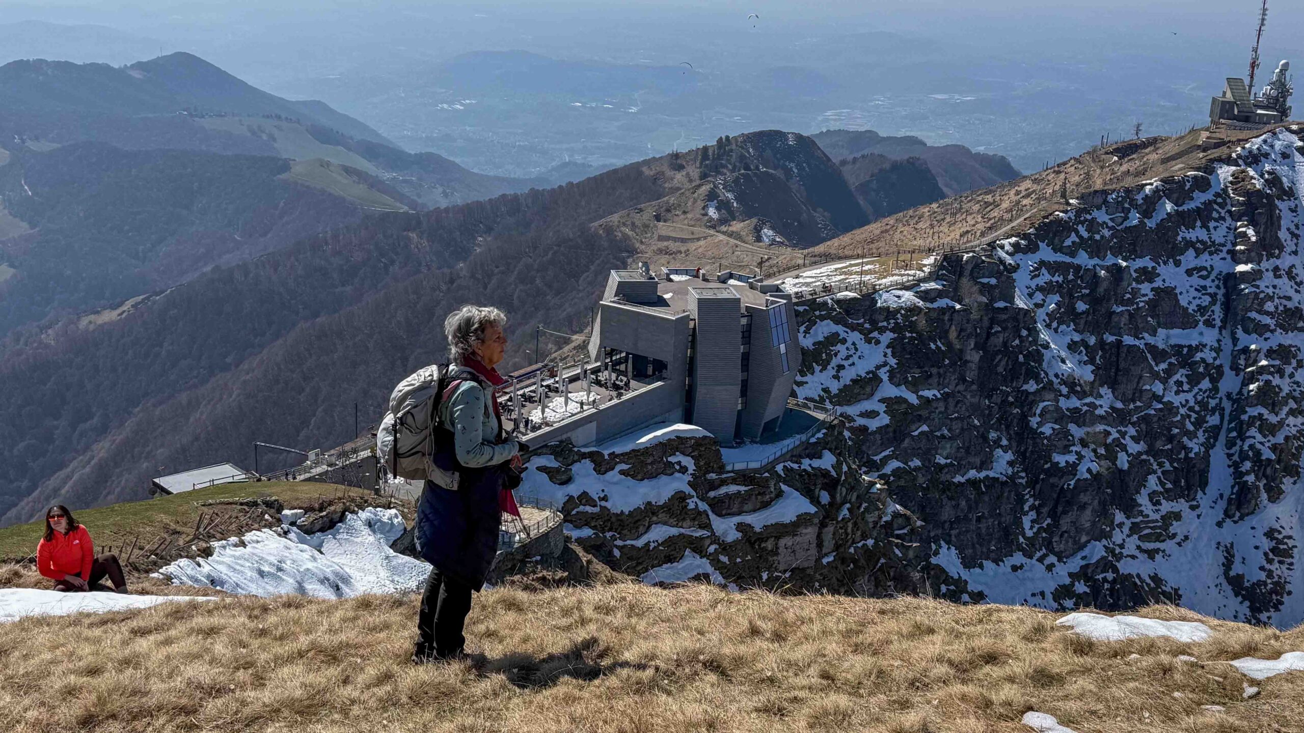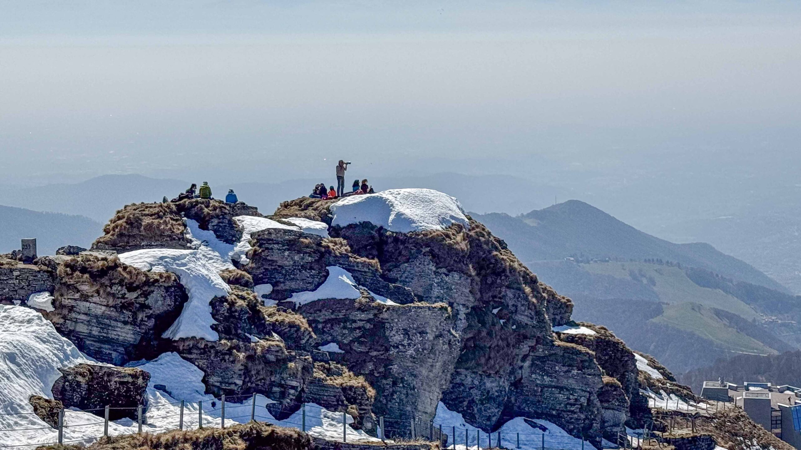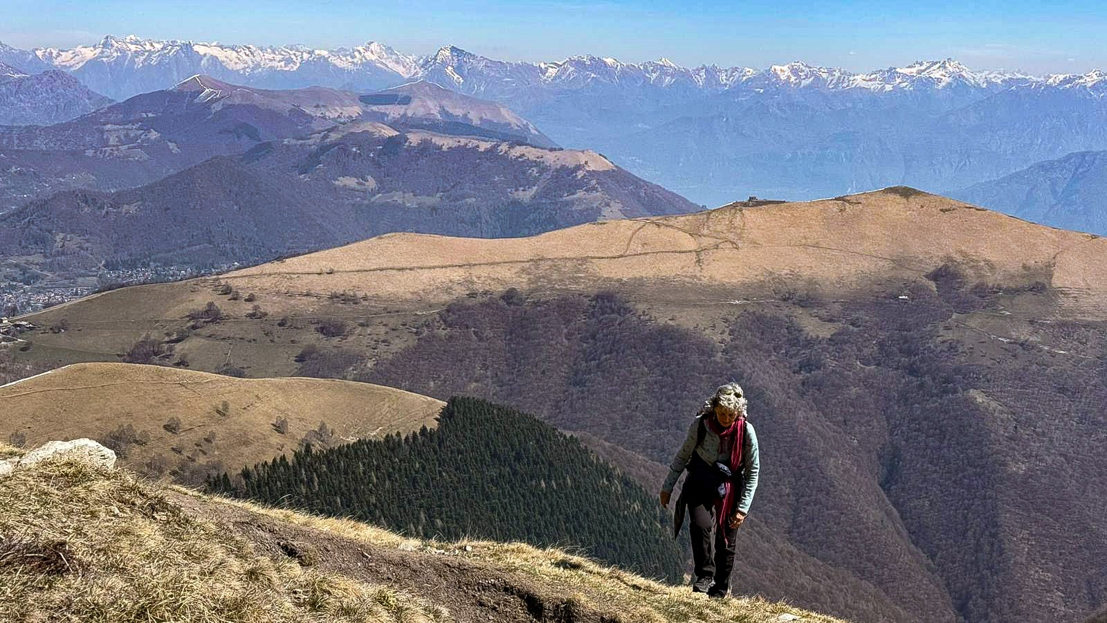 Oben lag noch etwas Schnee, aber der Weg zum Gipfel war schneefrei und gut zu begehen. Unterwegs kamen wir an einem Hang vorbei, an dem Gleitschirmflieger starteten. Dann ging es weiter hoch zu einer Aussichtsplattform in 1701 m Höhe. Von dort hatte man super Aussicht über die noch schneebedeckten Gipfel der Alpen, den Luganer See und in der Ferne auf den Comer See. Der Aufstieg zur Plattform ging oft über abgestorbenes Gras in dem überall blühende Krokusse herausragten.