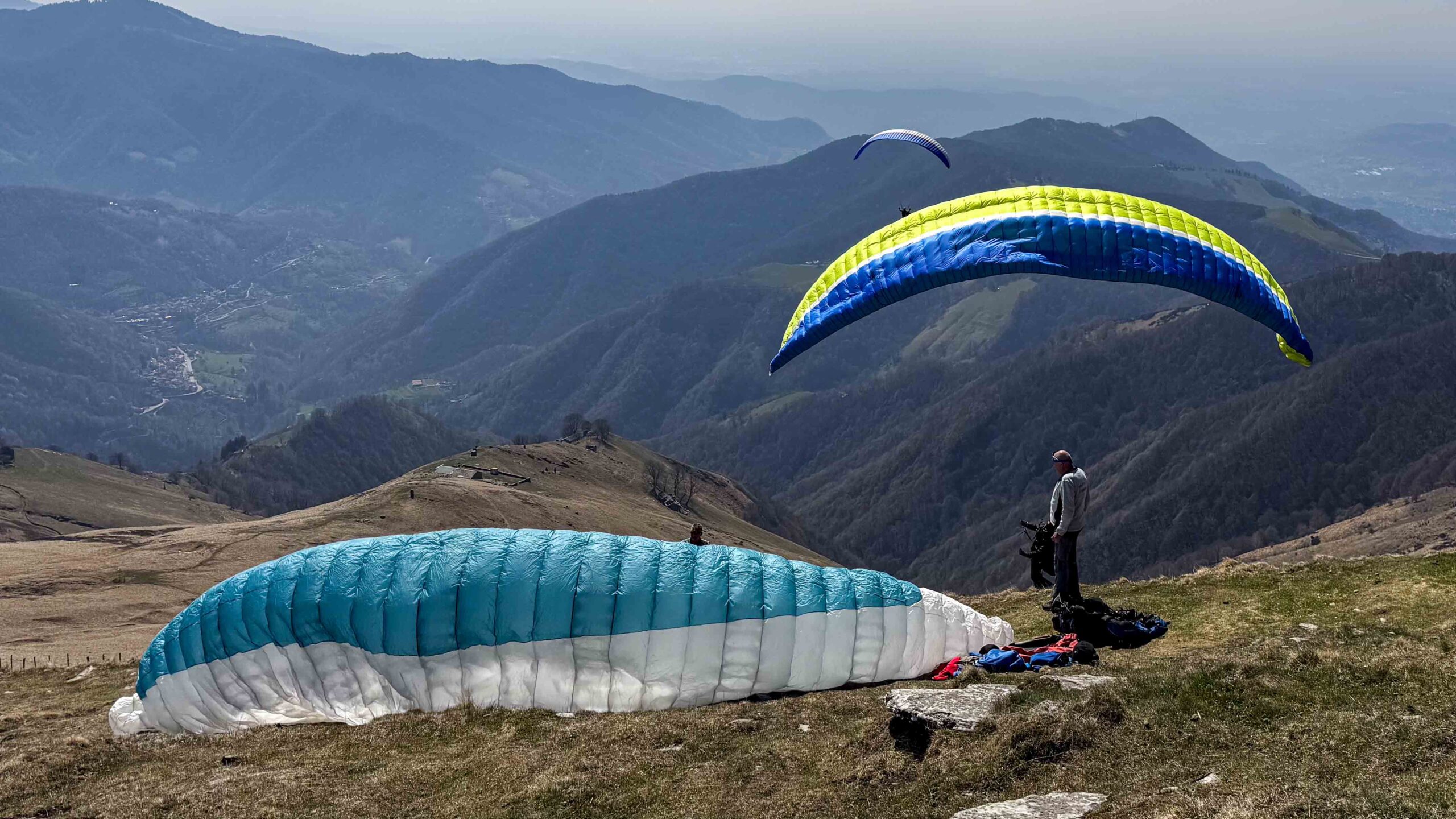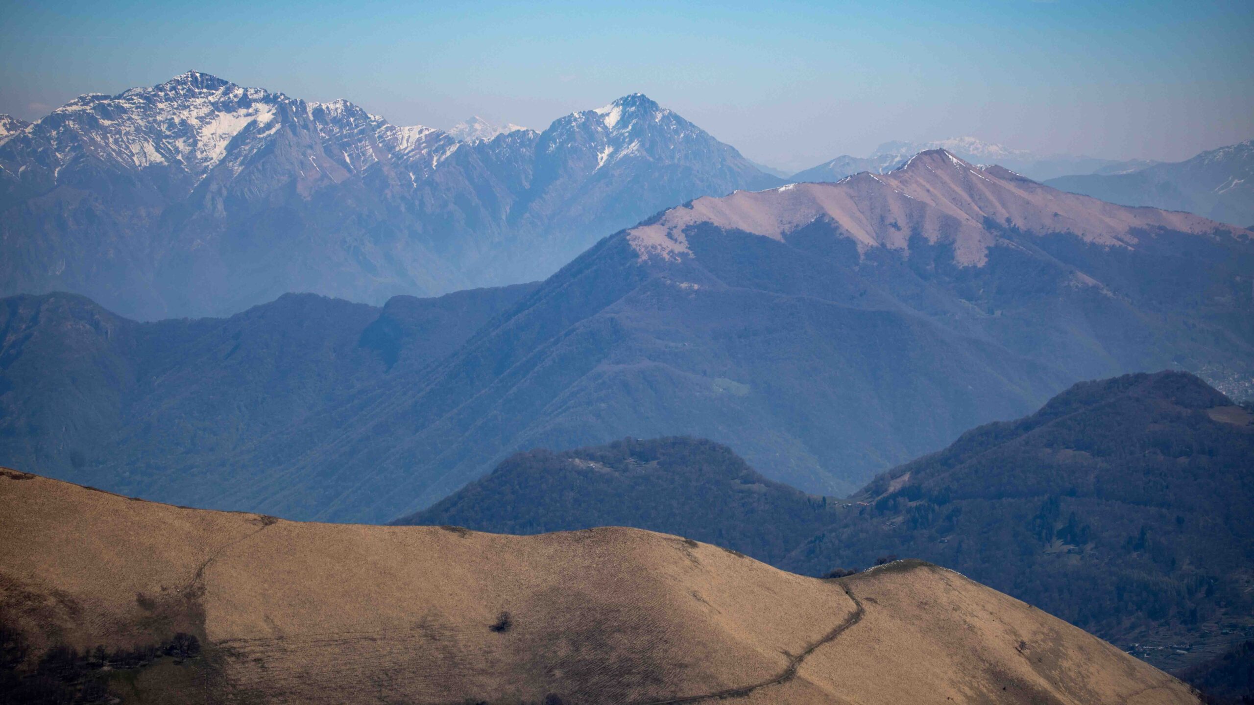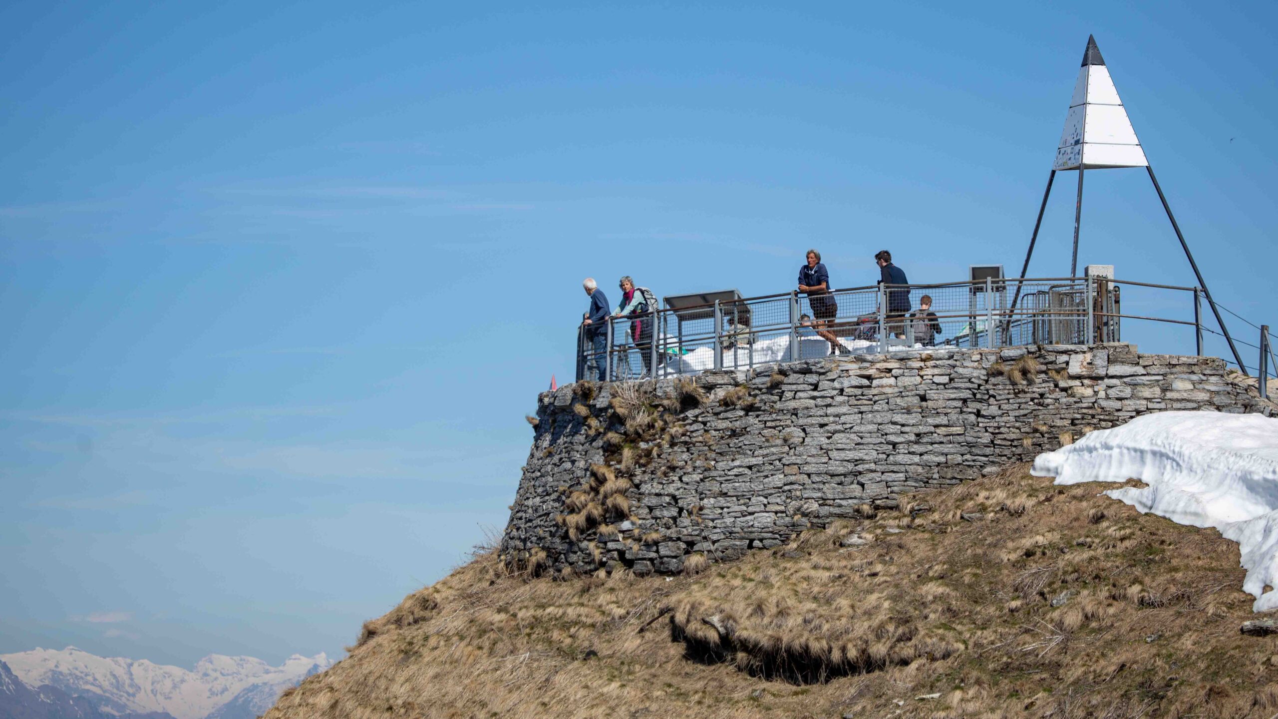 Oben lag noch etwas Schnee, aber der Weg zum Gipfel war schneefrei und gut zu begehen. Unterwegs kamen wir an einem Hang vorbei, an dem Gleitschirmflieger starteten. Dann ging es weiter hoch zu einer Aussichtsplattform in 1701 m Höhe. Von dort hatte man super Aussicht über die noch schneebedeckten Gipfel der Alpen, den Luganer See und in der Ferne auf den Comer See. Der Aufstieg zur Plattform ging oft über abgestorbenes Gras in dem überall blühende Krokusse herausragten.