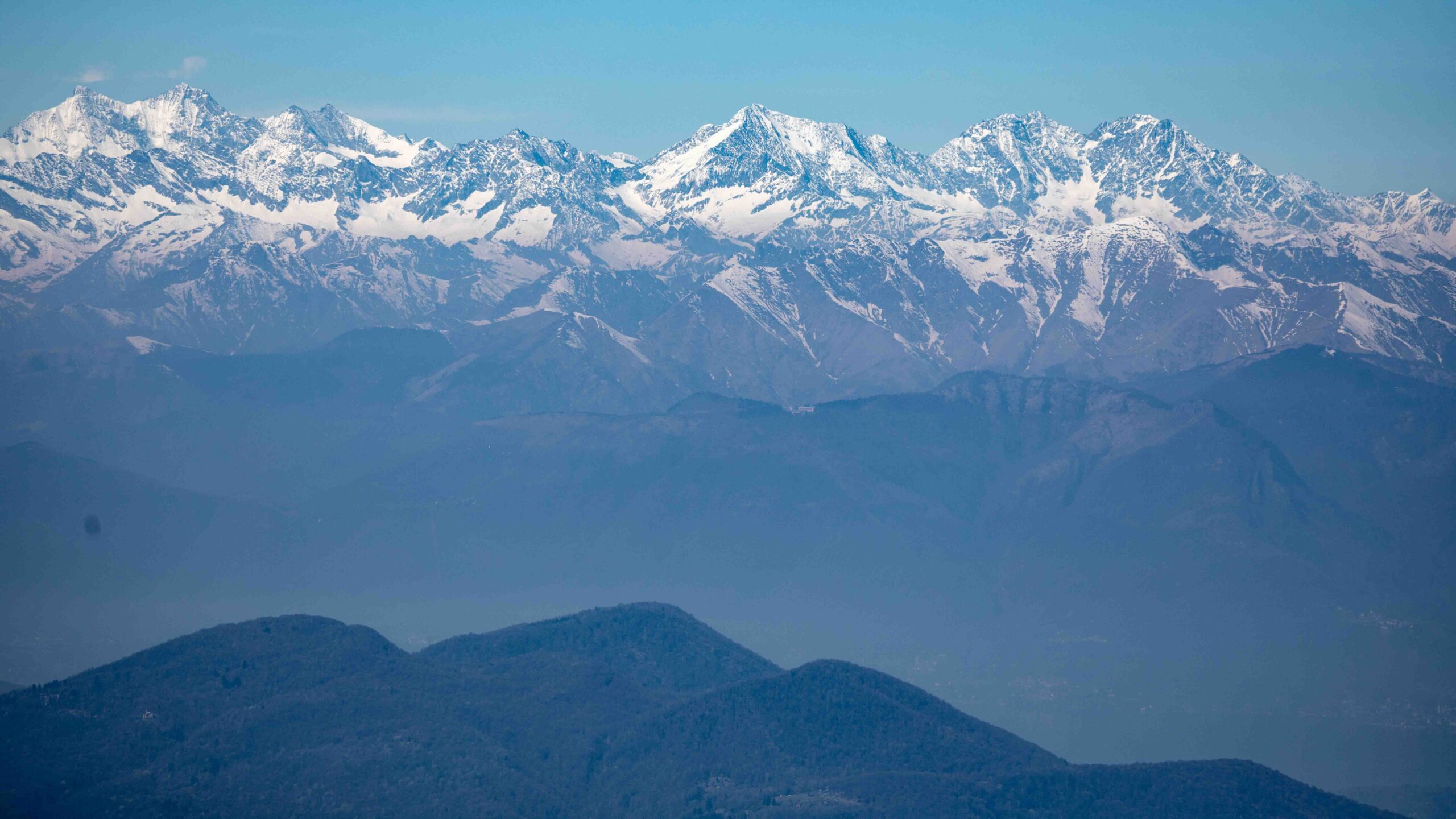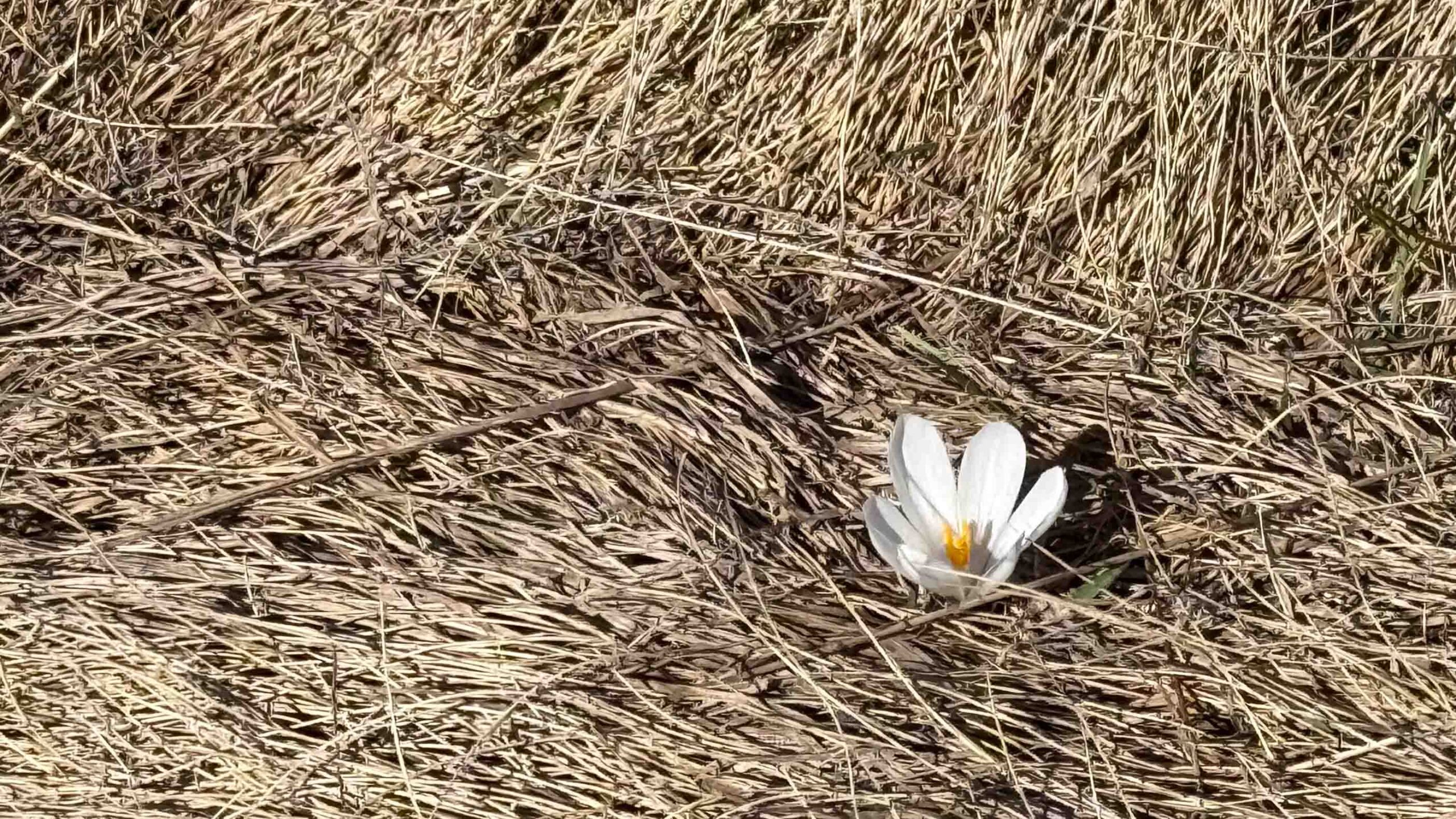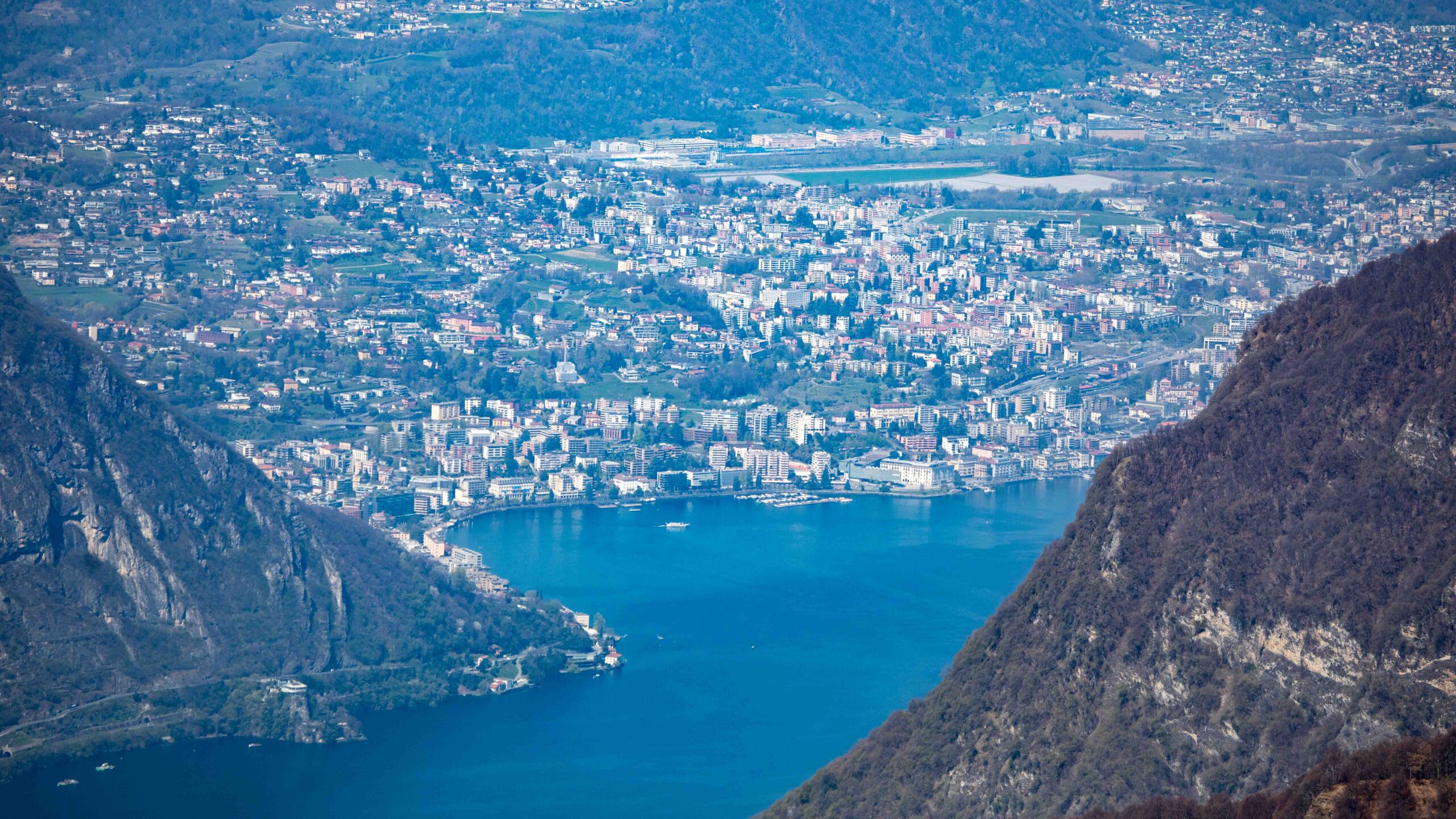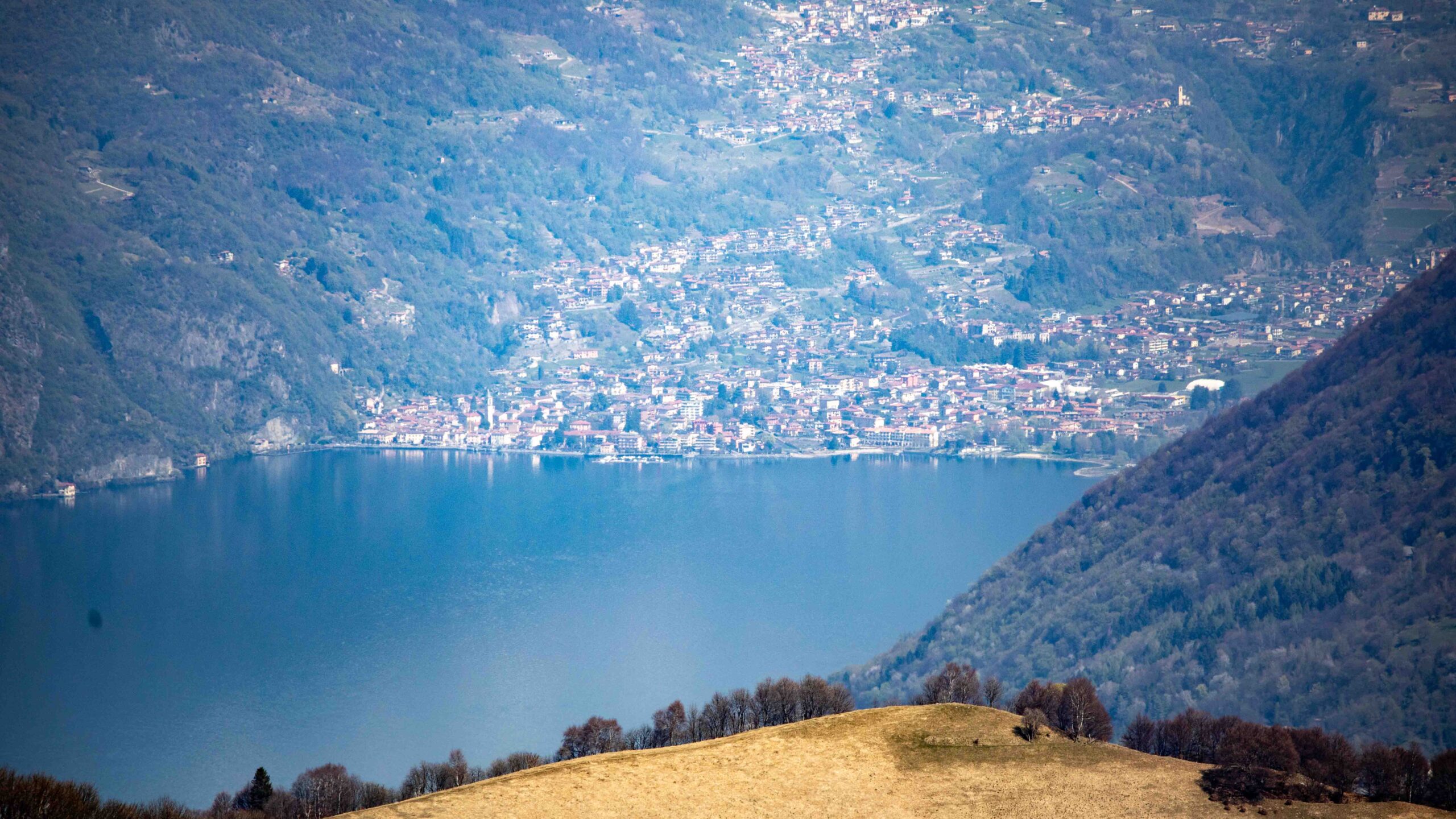 Oben lag noch etwas Schnee, aber der Weg zum Gipfel war schneefrei und gut zu begehen. Unterwegs kamen wir an einem Hang vorbei, an dem Gleitschirmflieger starteten. Dann ging es weiter hoch zu einer Aussichtsplattform in 1701 m Höhe. Von dort hatte man super Aussicht über die noch schneebedeckten Gipfel der Alpen, den Luganer See und in der Ferne auf den Comer See. Der Aufstieg zur Plattform ging oft über abgestorbenes Gras in dem überall blühende Krokusse herausragten.