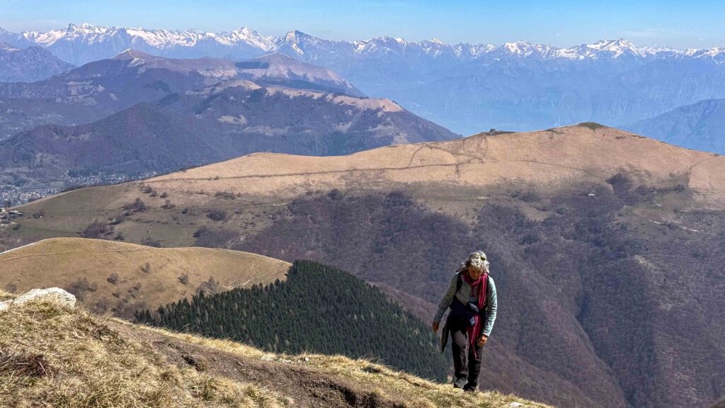 Oben lag noch etwas Schnee, aber der Weg zum Gipfel war schneefrei und gut zu begehen. Unterwegs kamen wir an einem Hang vorbei, an dem Gleitschirmflieger starteten. Dann ging es weiter hoch zu einer Aussichtsplattform in 1701 m Höhe. Von dort hatte man super Aussicht über die noch schneebedeckten Gipfel der Alpen, den Luganer See und in der Ferne auf den Comer See. Der Aufstieg zur Plattform ging oft über abgestorbenes Gras in dem überall blühende Krokusse herausragten.