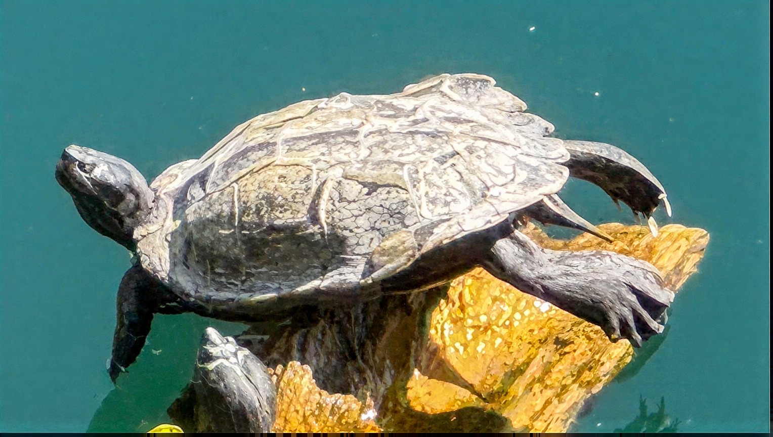 Karin entdeckte eine kleine Schildkröte, die im kalten Wasser des Sees herumschwamm. Später stellten wir fest, dass das keine Einzelgängerin war. Am Rand des Sees lagen einige Schildkröten auf Baumstämmen und Steinen und wärmten sich in der Sonne. Ein paar Schildkröten waren richtig grosse Tiere. Die grösste Schildkröte lag ganz außen auf dem Baumstamm und hatte eine besonders perfekte Lage erwischt. Etwas später versuchte das Tier neben ihr die Grösste zu erklimmen. Sie kam bedenklich ins Wackeln, die Kleinere rutschte jedoch ab und fiel ins Wasser. Auf einem Felsen lagen gleich 4 Tiere und eine kleine Schildkröte kam angeschwommen, erklamm den Stein und ruhte sich angelehnt an eine Größere aus.
