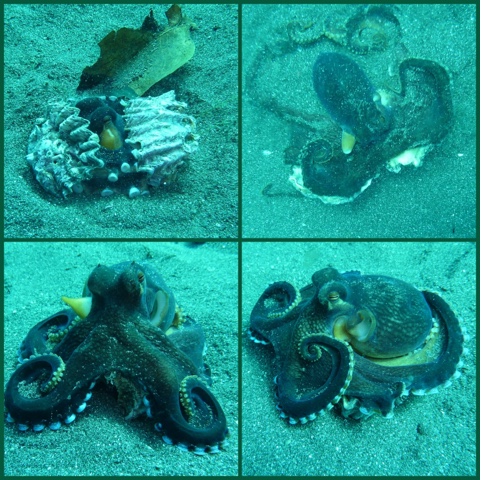 Jeff rief uns zu sich und war schon mächtig am sand aufwedeln. Erst war nix zu sehen, dann irgendwas, was wie ne muschel aussah und allmählich entdeckte ich zwischen den beiden muschelteilen einen coconut octopus. Der heisst so, weil er sich, wenn er welche findet, zwischen zwei kokosnussschalen versteckt. Wenns das nicht gibt, nimmt er eben zwei muscheln oder/und blätter, eben alles was sich so finden lässt. Dann buddelt er sich im sand ein, nur noch die augen schauen raus. Über die störung war er garnicht amused, deshalb haben wir ihn dann auch wieder in ruhe gelassen. Und schwupps war er wieder in seinem muschelhaus verschwunden.