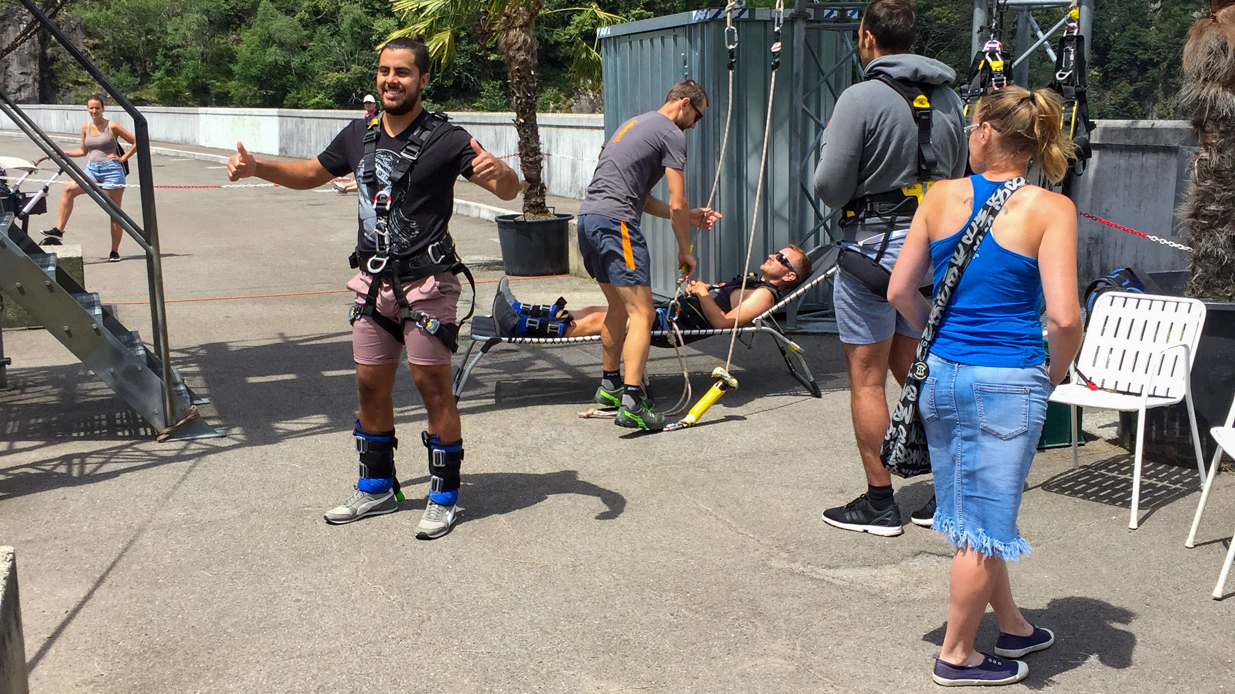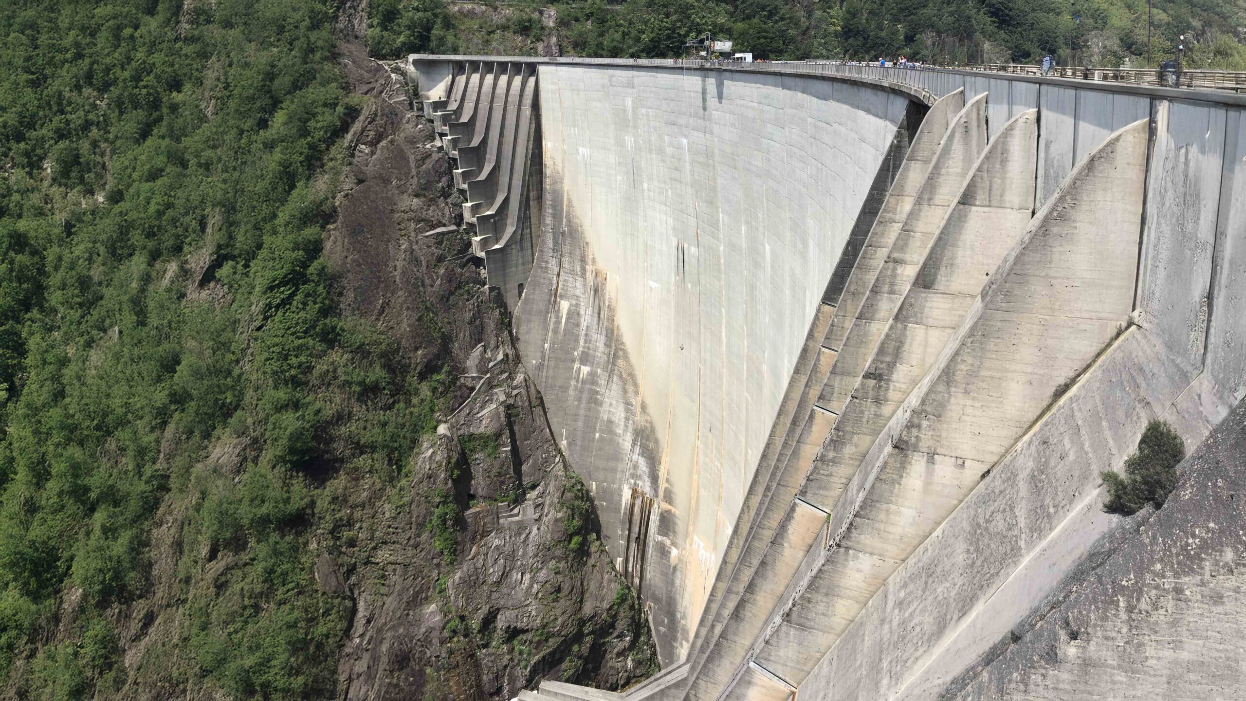 Leider stehen wir am falschen Pier an und mussten dann doch noch rennen, um die Fähre zurück zum Hotel rechtzeitig zu erreichen. Am Abend spielt Deutschland gegen Schweden bei der Weltmeisterschaft in Russland. Wir verpassen die erste Halbzeit, da die Fähre sehr langsam unterwegs ist. Im Hotel Bellavista steht ein grosser Fernseher, aber niemand außer uns interessiert sich für das Spiel. Es gibt nichts zu trinken, da das Restaurant wegen einer privaten Feier geschlossen ist. So muss ich tatsächlich ins benachbarte Restaurant gehen, um ein Bier zu kaufen. Ich war ziemlich sauer auf den Service im Hotel und das spiegelt sich in der Bewertung bei Booking.com auch wider. Deutschland gewinnt in der letzten Minute der Nachspielzeit durch einen Freistoß, eigentlich unverdient. Im Zimmer ist es dann heiss und stickig, die Klimaanlage macht nur Krach, kühlt jedoch gar nicht. Wir schlafen am offenen Fenster trotz des Krachs der Hauptstrasse. Das Frühstück auf der sehr schönen Terrasse am See ist leider nur „geht so“, kostet jedoch trotzdem 10 Euro pro Person. Wir sind froh am nächsten Morgen weiterzukommen. Die Fahrt geht am Luganer See entlang und kurz vor der Grenze zur Schweiz gehen wir in einen, am Sonntag geöffneten, Supermarkt, um noch Verpflegung einzukaufen. Auf der Fahrt hoch ins Tal beobachten wir die Bungeespringer an der Verzasca-Talsperre. Der James Bond Golden Eye Sprung geht 220 m in die Tiefe. Schon beim Zuschauen bekommen wir die Anspannung solch eines Sprungs mit. Wir sind uns einig, dass das nichts für uns ist.
