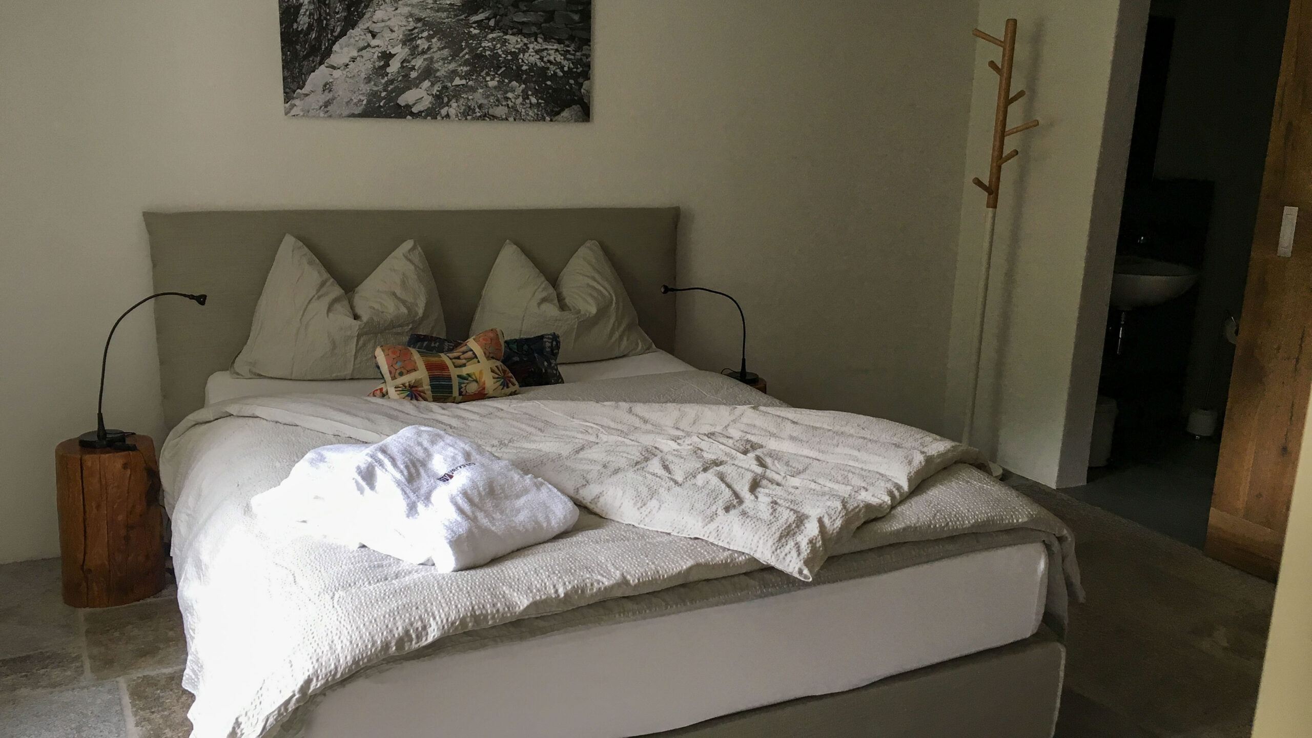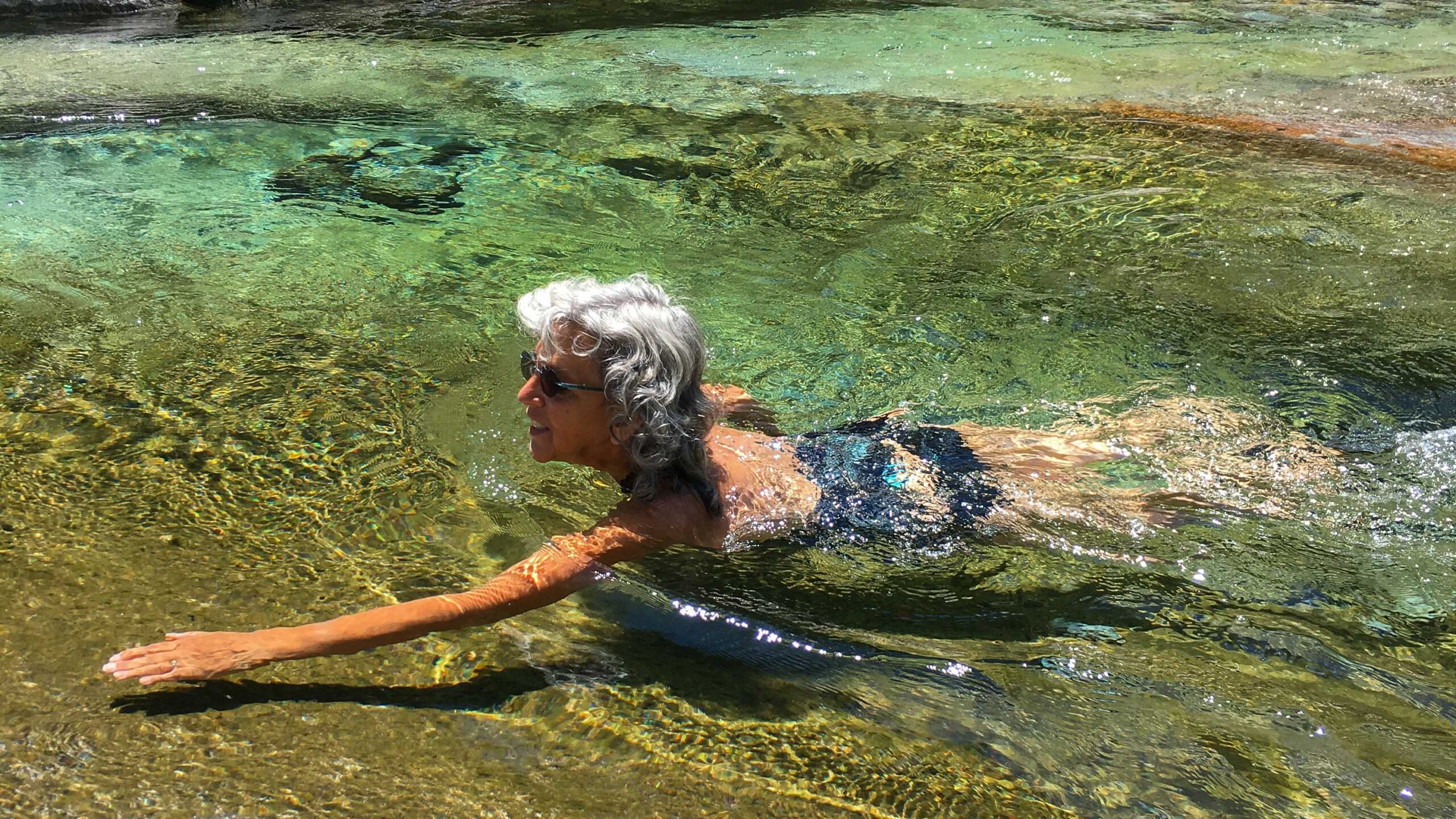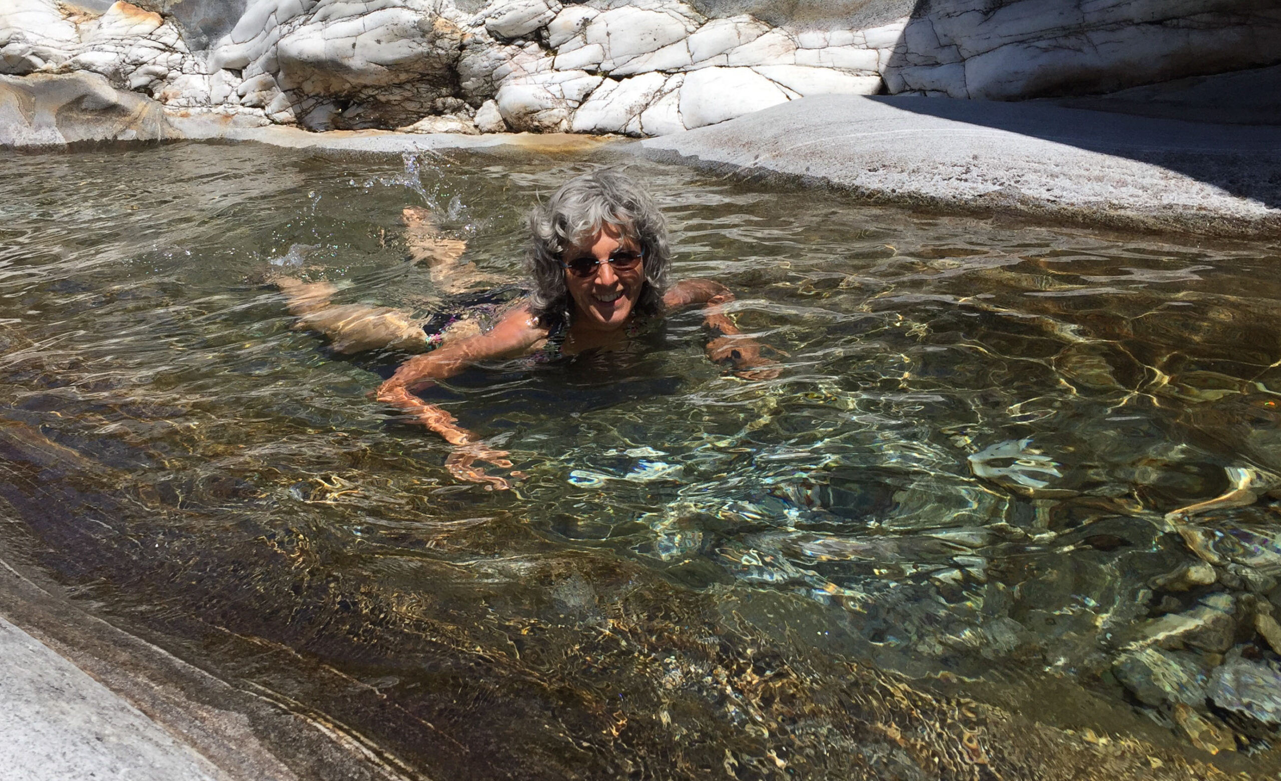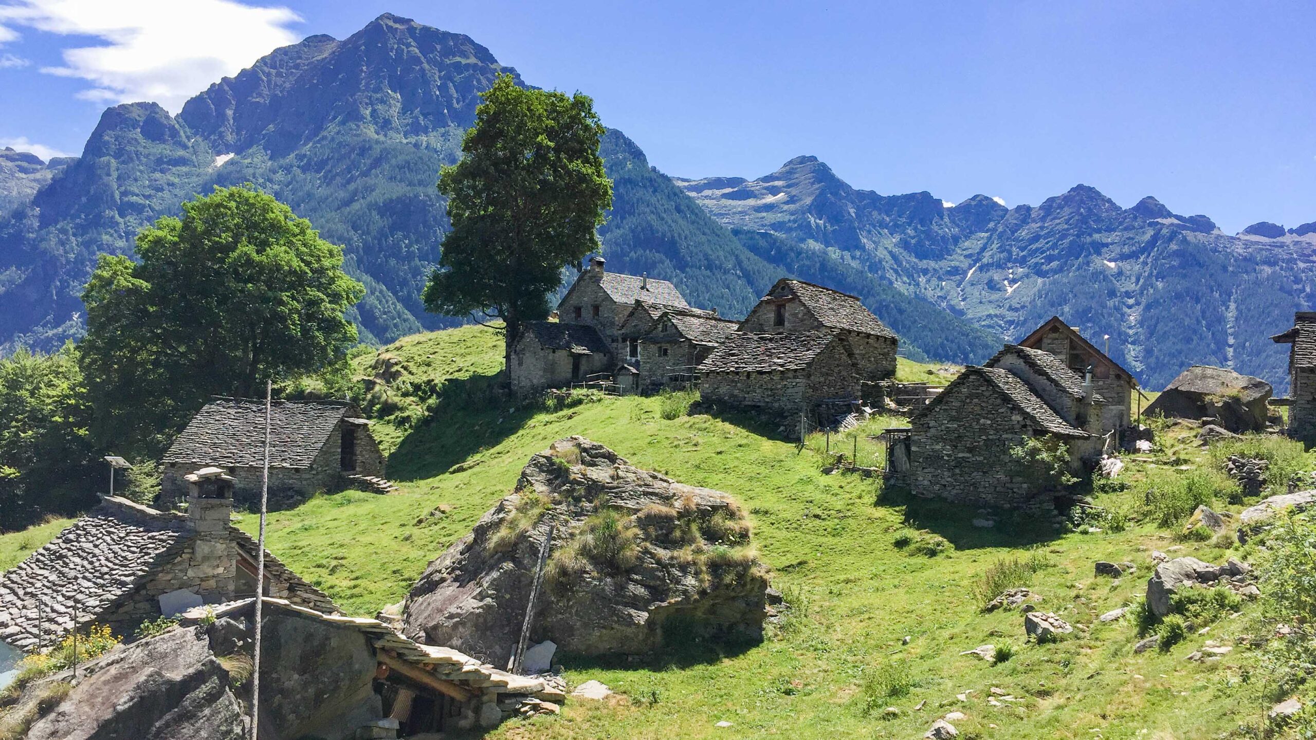 Besonders gut gefällt uns das Osala-Tal, das direkt in Brione abzweigt. Es geht ca. 4 km gemächlich bergauf, danke der E-Bikes eine machbare Strecke, bis die geteerte Strasse in einen Schotterweg übergeht. Nach ca 3 km entdecken wir schöne Steinplatten direkt am Fluss und lassen uns dort für ein paar gemütliche Stunden zum Lesen und Baden nieder. Das Wasser ist ziemlich kalt, vielleicht 12 °C. Die Kälte ist besonders an den Füssen unangenehm und schmerzt richtiggehend. Aber es reicht, um sich für eine Minute hineinzustellen und kurz unterzutauchen, ein paar Schwimmzüge zu machen. Die Strömung ist so stark, dass man nur ins Kehrwasser kann.