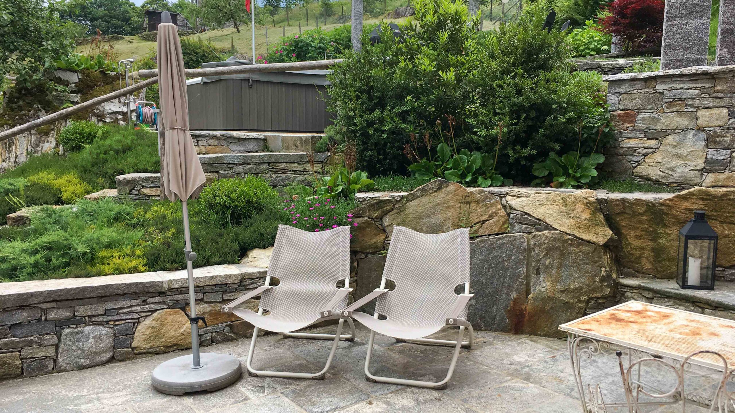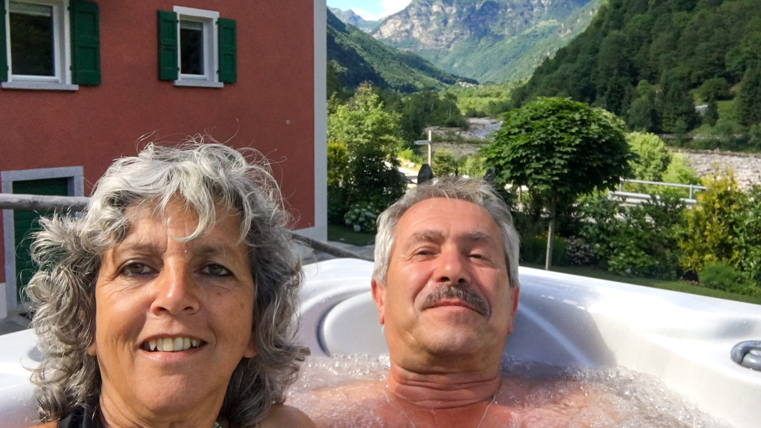 Die nächsten 5 Tage werden wir in der gemieteten Ferienwohnung im Casa Rossa in Brione verbringen. Davide, der Vermieter empfängt uns sehr freundlich und wir sind überrascht, wie geschmackvoll das frisch renovierte ehemalige Rustiko eingerichtet ist. Da die Preise für ein Abendessen in der Schweiz auf ziemlich hohem Niveau sind, beschliessen wir das auszulassen und in der kleinen Küchenzeile selbst zu kochen. Das hat auch den Vorteil, dass wir die Fussballspiele nebenher beobachten können. In der Ferienwohnung steht nämlich ein schöner großer Fernseher und die Küche ist ausreichend ausgerüstet, um für 2 Personen zu kochen. Man kann in einem kleinen Laden in Brione einkaufen, keine Spezialitäten, aber es reicht um gut zu essen. Die Ferienwohnung ist neu renoviert, ein alter Granitfussboden, der originalgetreu wieder eingebaut wurde, sehr schönes Bad, Schlafzimmer mit gutem Bett, vor der Tür des Hauses ein schön angelegter Garten, ein Kräutergarten zum Bedienen, ein großer Grill und ein Jakuzzi (32 °C heiss), den wir fast jeden Abend benutzen. Einzige Wermutstropfen – es hat viele Stubenfliegen, die wir nach und nach killen müssen, um in Ruhe Abendessen zu können und die Wohnung liegt an der Durchgangsstrasse. Immer mal wieder müssen Testosteron-geschwängerte Motorradfahrer die Gerade vor dem Haus nutzen, um ihren Auspuff zu reinigen. Aber das kennen wir von zu Hause und regt uns nicht auf.