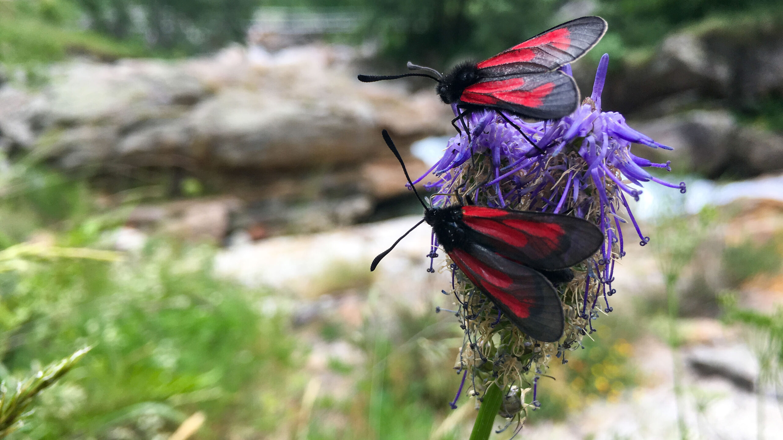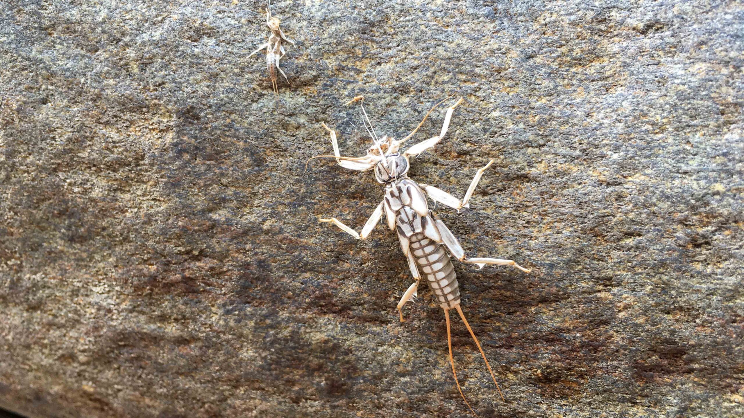 An den Felsen entdecken wir Larven von Steinfliegen, die zur Imaginalhäutung das Gewässer verlassen haben und eine überfahrene Schlingnatter. Was für ein schlechtes Karma muss diese Schlange gehabt haben, dass sie auf diesem kaum befahrenen Weg von einem Fahrrad überfahren wurde.