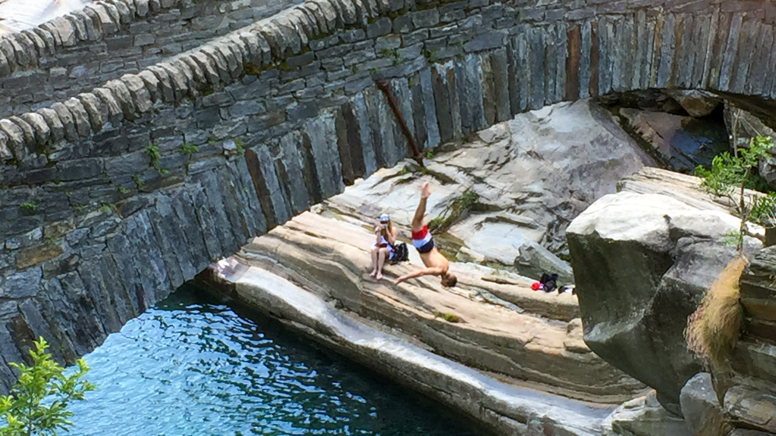 Wir fahren talabwärts nach Lavertezzo, 4 km ziemlich steil hinunter. Achim kommen Zweifel, ob wir diesen Rückweg wirklich schaffen werden. In Lavertezzo gibt es eine alte Brücke über die Verzasca, die zu schön ausgewaschenen Felsen führt. Man kann auf ihnen herumklettern, sich auf die warmen Steine legen und sogar unter der Brücke tauchen. Ein mutiger Junge springt von der Brücke ins kalte Wasser – immerhin 14 m liegen zwischen Brücke und Wasser. Wir legen ein paar Stunden auf den Felsen, beobachten eine Schülergruppe beim Schulausflug und machen uns dann auf den Rückweg. Die 4 km bergauf sind ein Kinderspiel, oben wundern wir uns, dass wir völlig entspannt ankommen. Unser Vertrauen in die Möglichkeiten, die uns die E-Bikes erschliessen, steigt sichtlich.
