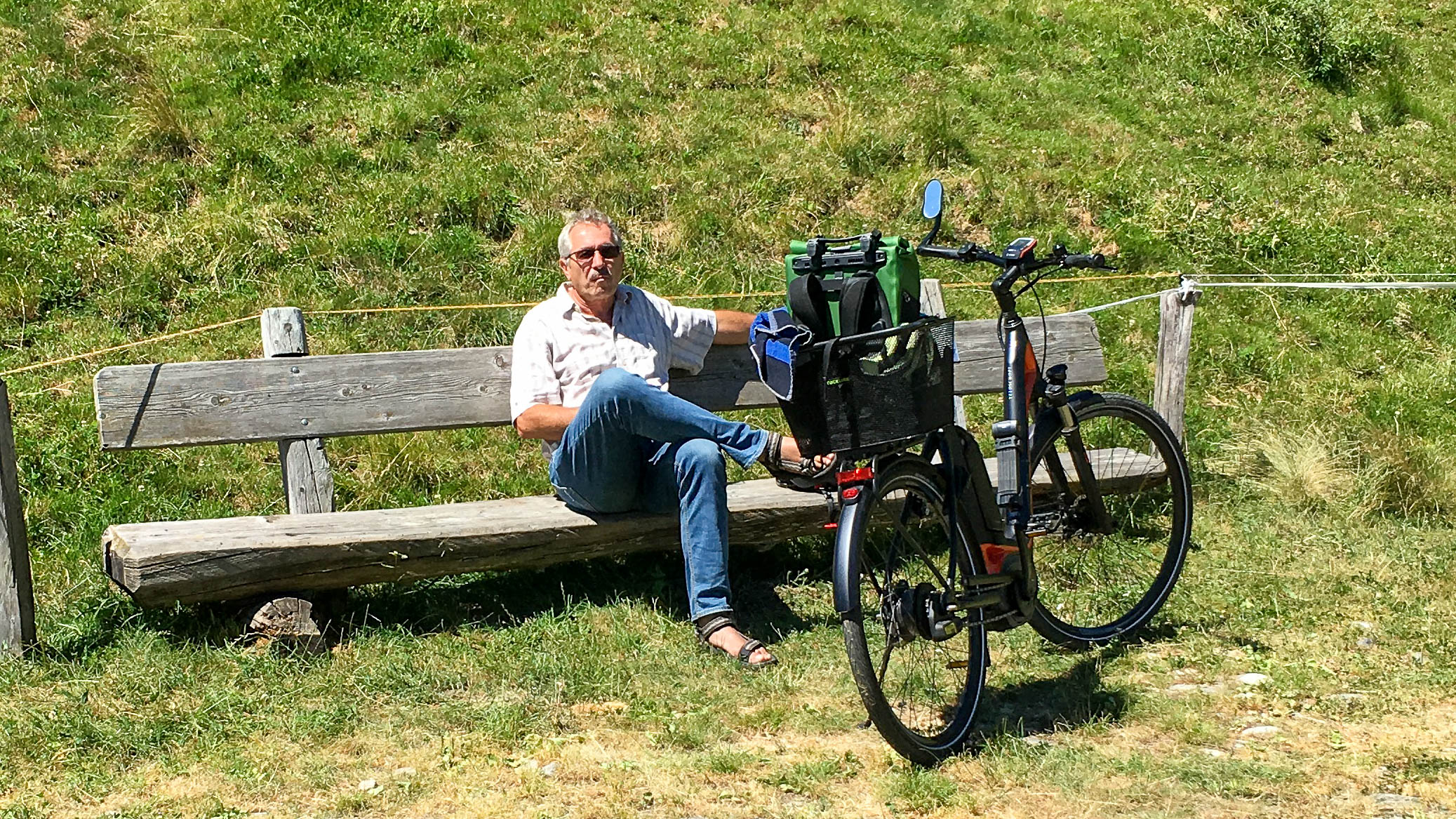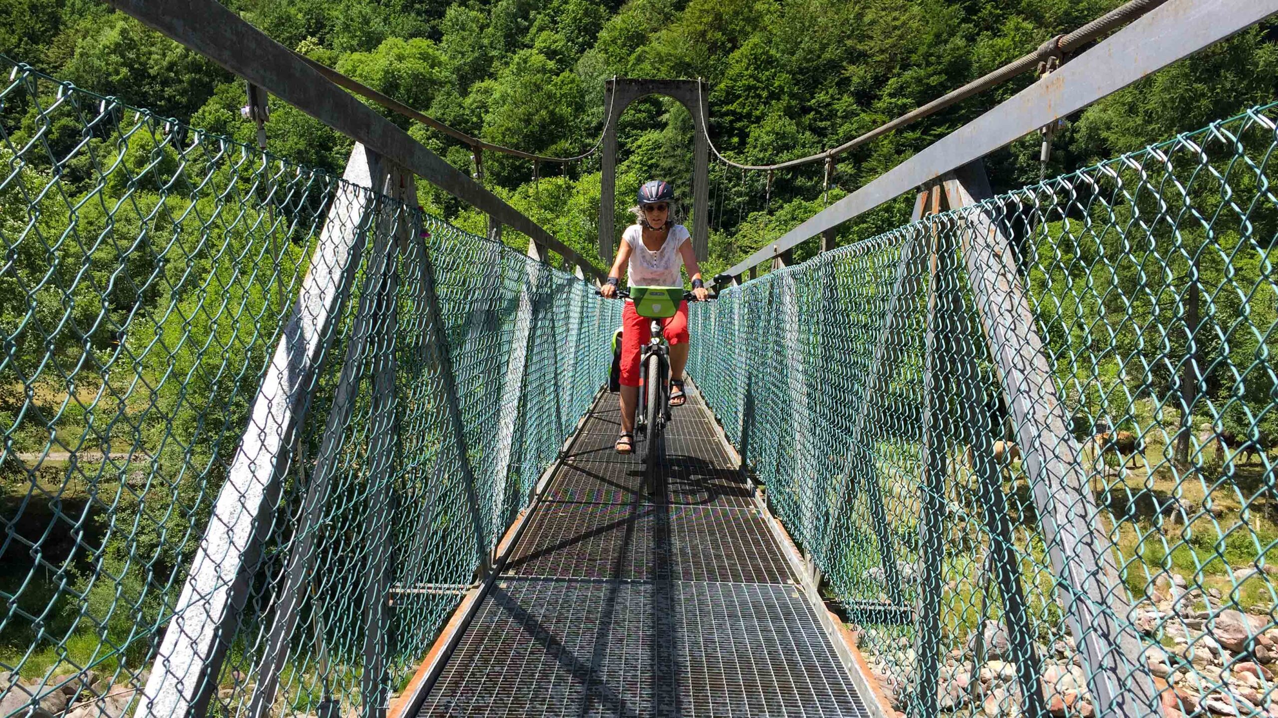 Am letzten Tag wollen wir es dann wissen. Es gibt noch eine Strecke 4 km steil bergauf zum Monte Valdo, die wir noch nicht gefahren waren. In der Tat erwies sich diese Strecke als sehr steil. So steil, dass Achim mit der Nuvinci-Schaltung nicht mehr und Karin nur noch im Turbo-Modus weiterkam. Aber es gibt ja noch die Möglichkeit, verschiedene Gänge zu benutzen. Im ersten Gang konnte Achim dann wieder anfahren und die restlichen 500 m überwinden. Oben befand sich eine kleine Siedlung aus Rusticos, alles aus Granit, ein Rasen, der jedem Golfplatz eine Ehre gewesen wäre. Ein paar Kühe weiden und man hat einen tollen Blick auf die Berge ringsum. Der Akku war durch den Anstieg auf weniger als die Hälfte seiner Kapazität gesunken. Die Abfahrt mussten wir gemächlich angehen, um ein Versagen der Bremsen zu vermeiden. Wieder unten, fahren wir über eine Hängebrücke und haben noch genug Akkukapazität, um nochmals in eines der Täler von Sonogno zu fahren. Nach einer Brücke kommt ein Tor, nach diesem Tor fährt man auf eigene Gefahr, da es immer wieder zu Steinschlag kommt. Der Weg ist mit Rasensteinen belegt und man bekommt das Gefühl über ein Pflaster zu fahren. Ziemlich anstrengend und so brechen wir nach etwa einem Kilometer ab.